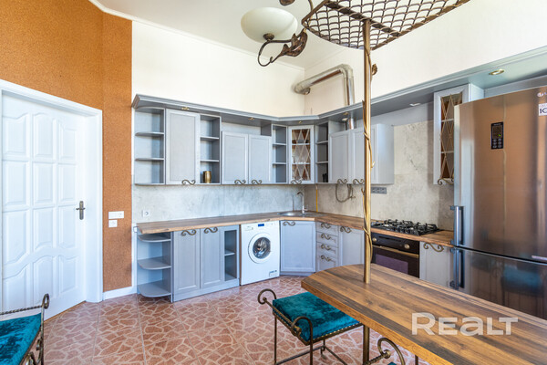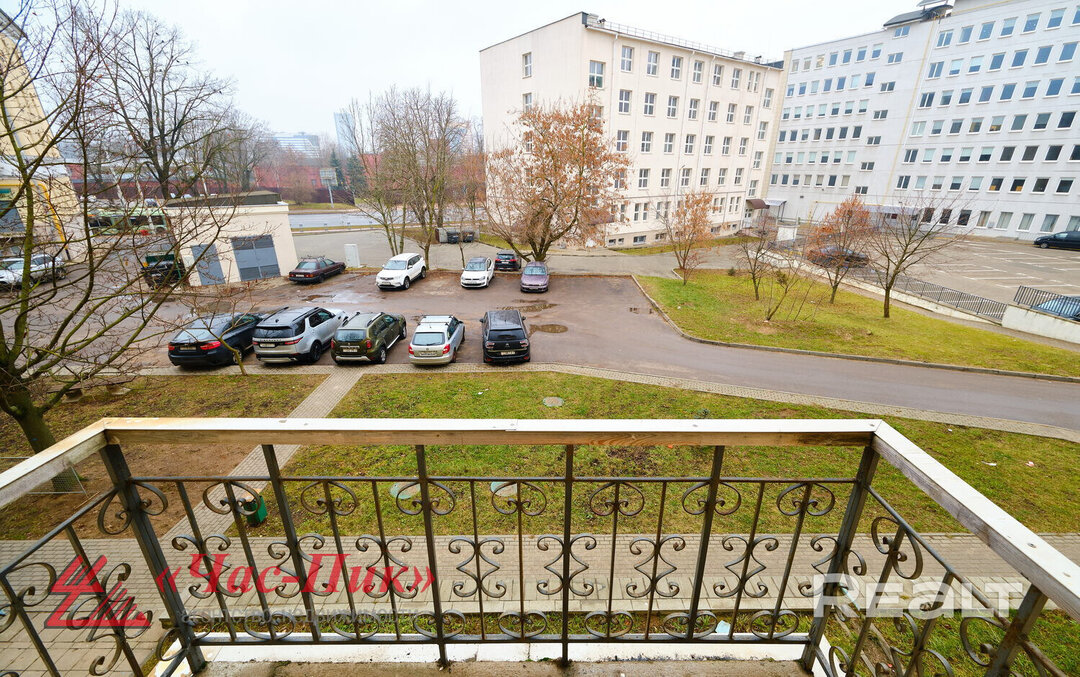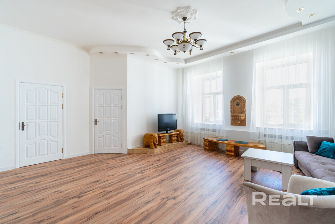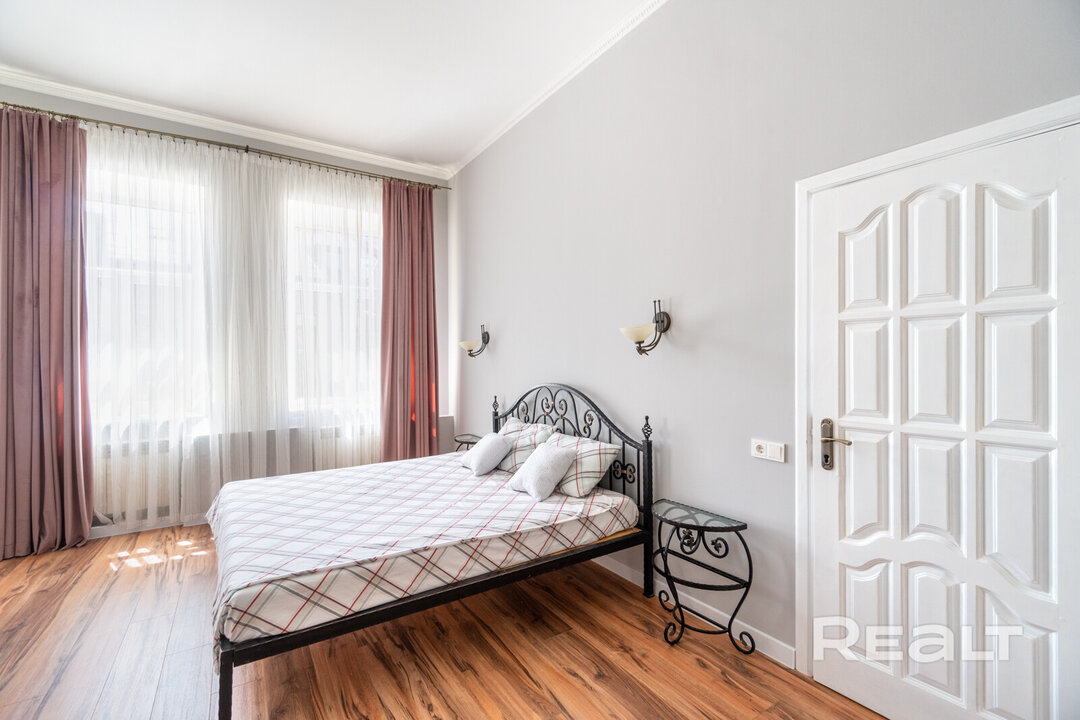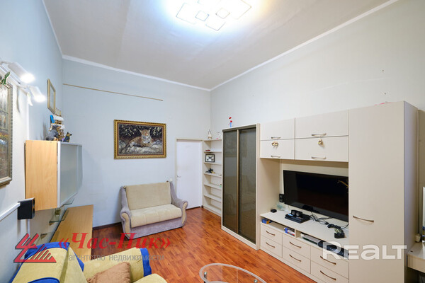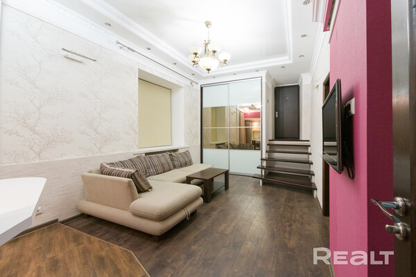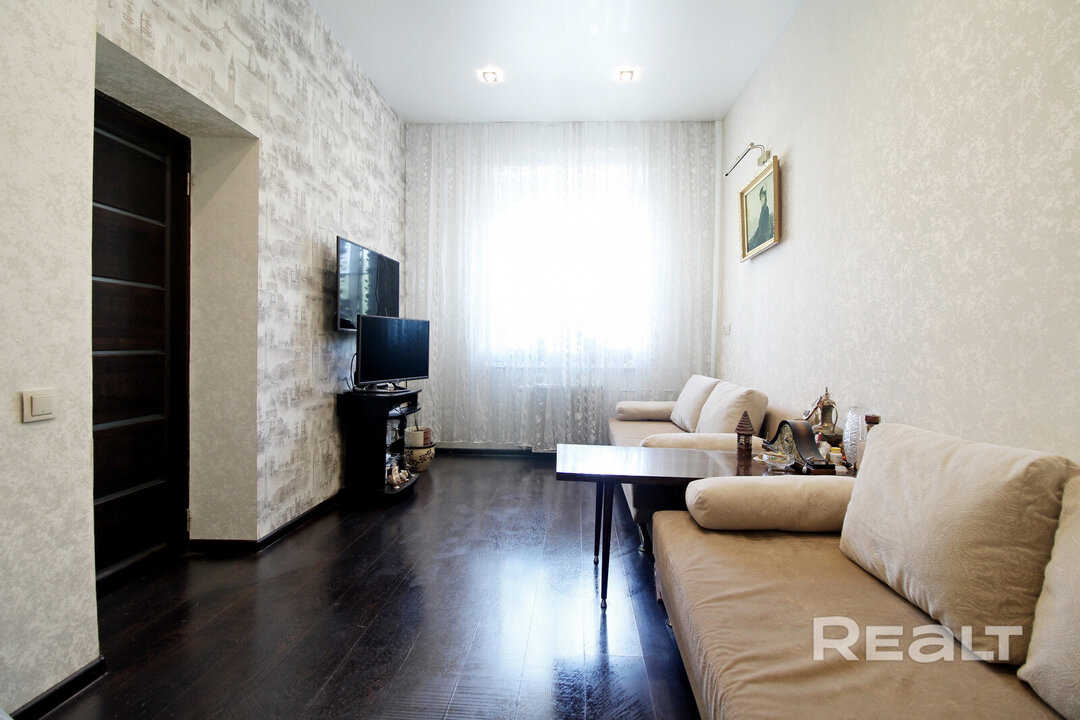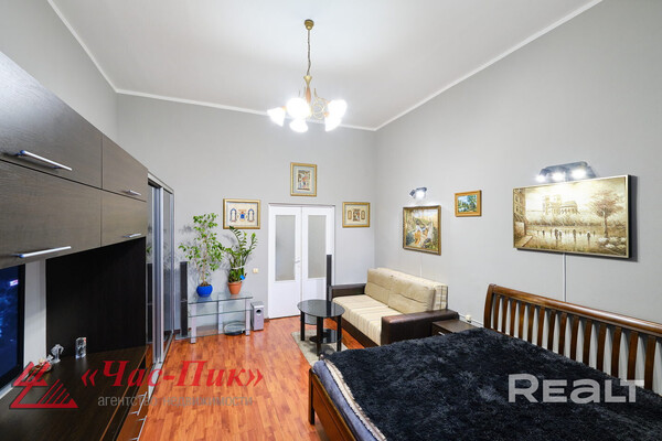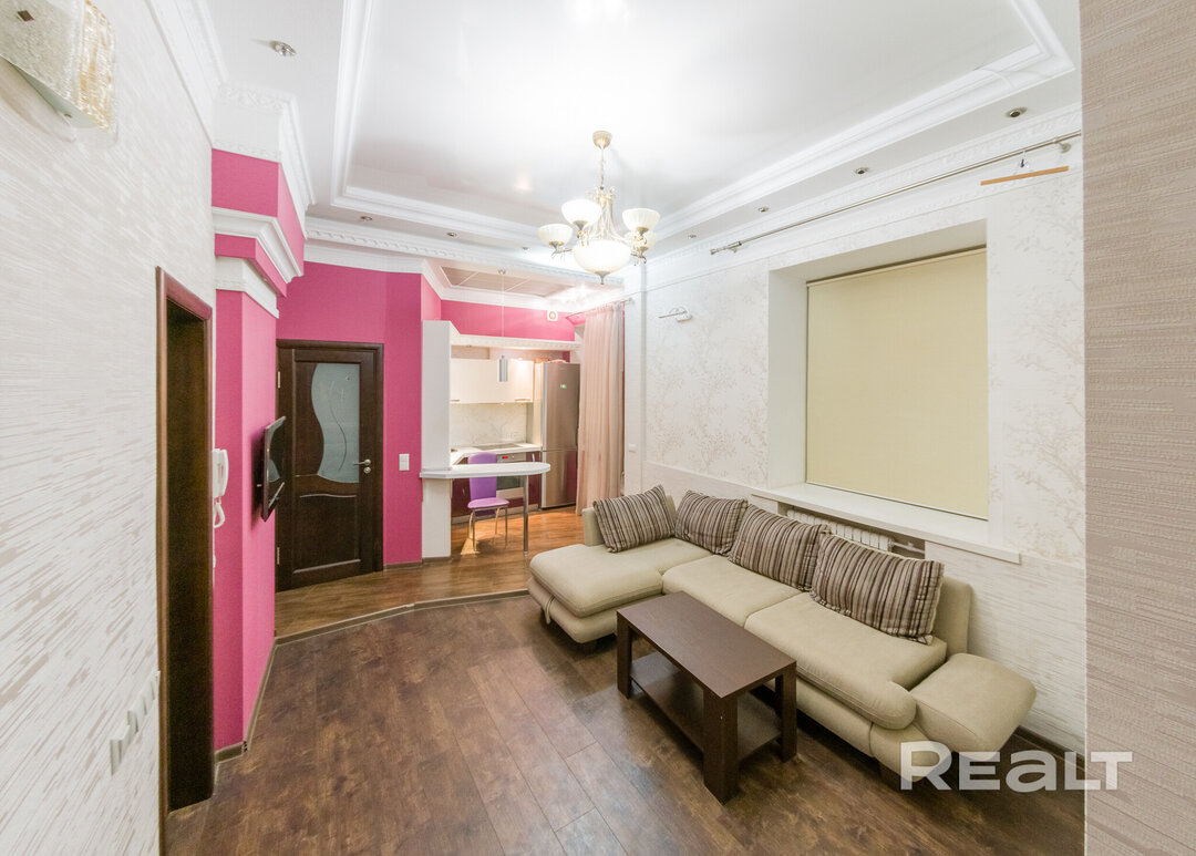 Дом отличают высокие потолки — 3,15 метра. Окна выходят на тихий зеленый благоустроенный двор. Подчеркивается, что при капитальном ремонте дома произведена замена коммуникаций. Про окружение и говорить не приходится: рядом можно найти множество магазинов, торговых центров, ресторанов, кафе и многого другого. Неподалеку находится железнодорожный вокзал, станции метро «Первомайская» и «Купаловская», набережная реки Свислочь с велодорожкой и местами для отдыха. Продают квартиру за 89 тысяч долларов (2993 доллара — за метр).
