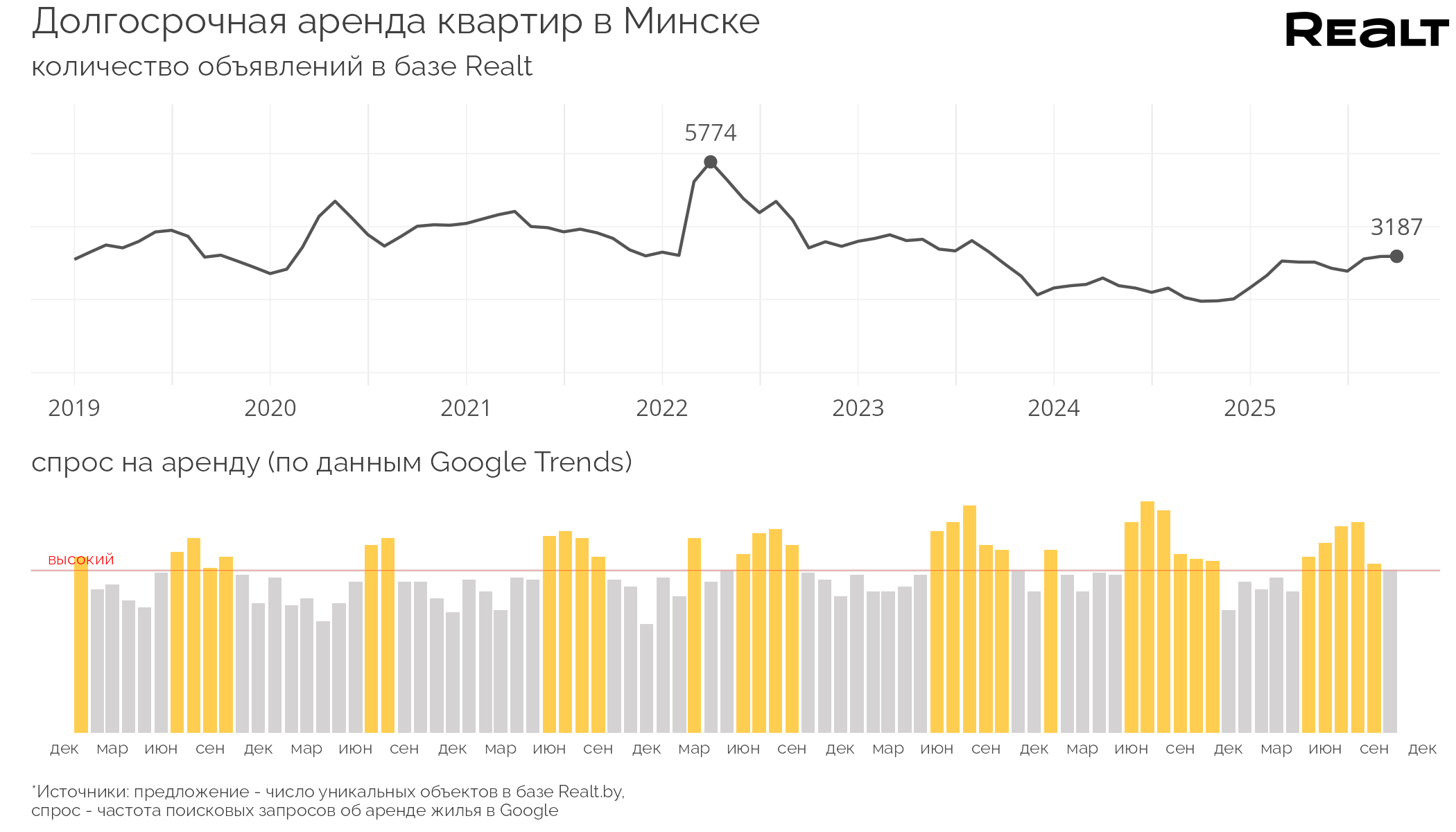 Долгосрочная аренда квартир в Минске продолжает быть востребованной. На фоне стабильного спроса, продолжают подрастать стоимости аренды, но в осенние месяцы темпы роста снизились. В первую очередь мы связываем это с достижением ими достаточно высокого для Минска уровня. Но еще не максимального.
