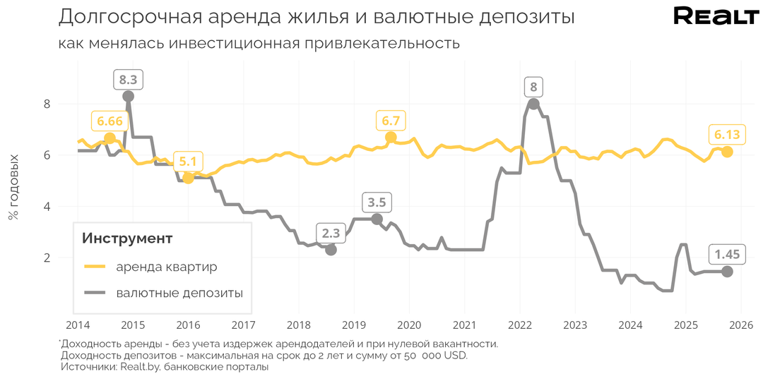Доходность от сдачи квартир в долгосрочную аренду в текущем году находиться на уровне 6% годовых и существенно не меняется. Максимальная доходность валютных депозитов за это же время также не изменилась. На данный момент аренда позволяет заработать в 4.23 раза больше, чем лучшие депозиты в валюте.