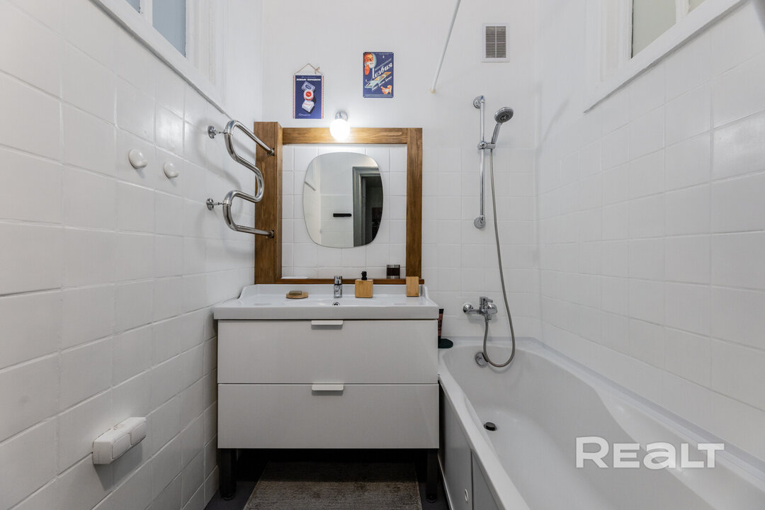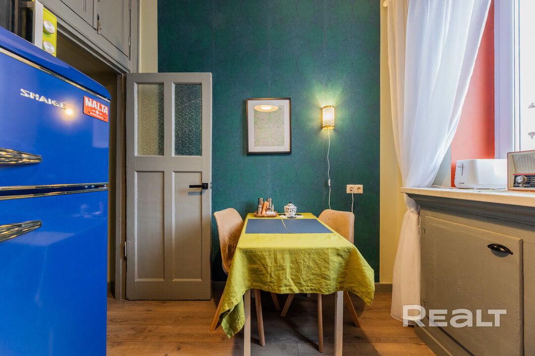 Квартира полностью готова к проживанию. Тут была выполнена полная замена сантехнических трубопроводов, заменена электропроводка. Несмотря на то, что сделан современный ремонт, владельцы сохранили элементы, которые подчеркивают историю дома: на потолке — галтели и розетки, а также холодильник в стене кухни.