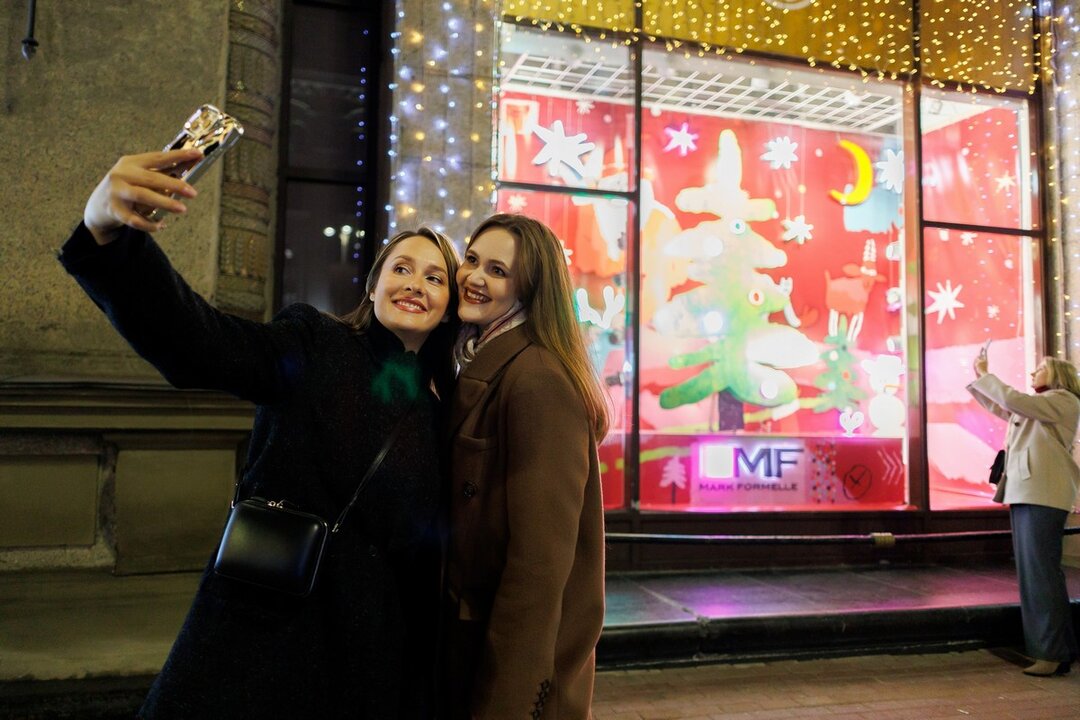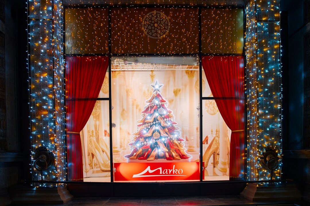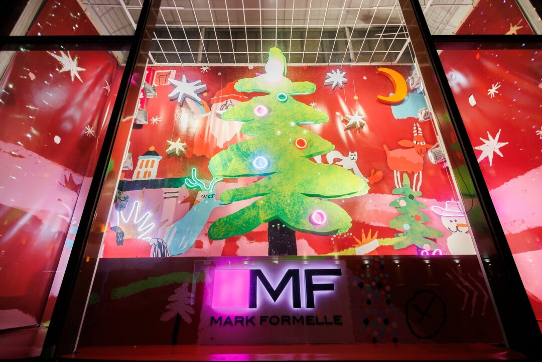 Одну из самых ярких витрин оформил Mark Formelle. В ее основу легла иллюстрация, созданная известным художником-примитивистом Ильей Кутобоем специально для модного бренда. В витрине можно увидеть новогодний пейзаж и персонажей — Деда Мороза, елку и лошадь — символ 2026 года. Ключевая идея работы — в погружении в мир ярких красок, теплых оттенков и смелых форм.