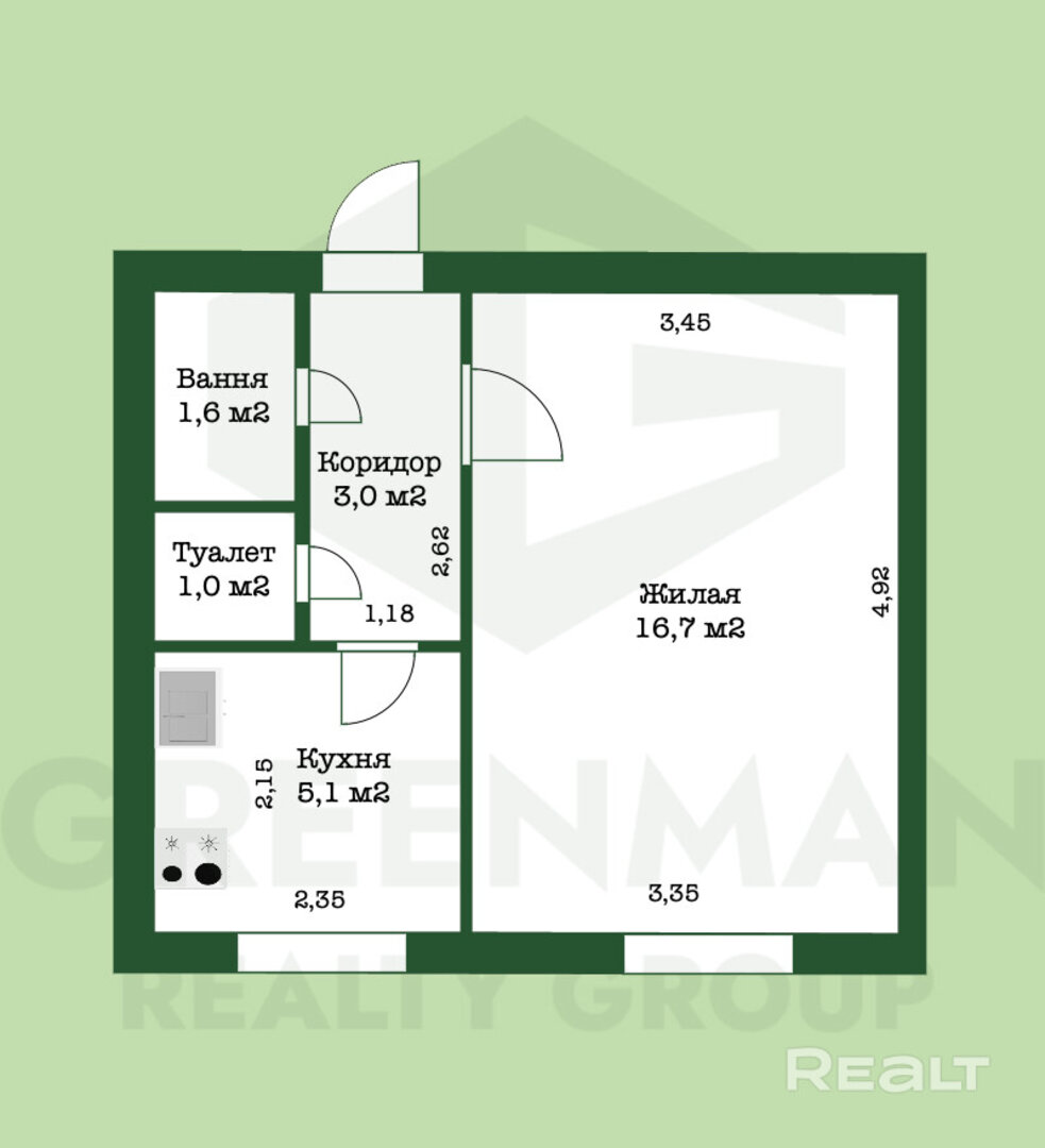 Однокомнатная квартира на первом этаже трехэтажного дома на улице Коржа, 6. Это в 10-15 минутах пешком или в 5 минутах на общественном транспорте от станции метро «Грушевка».