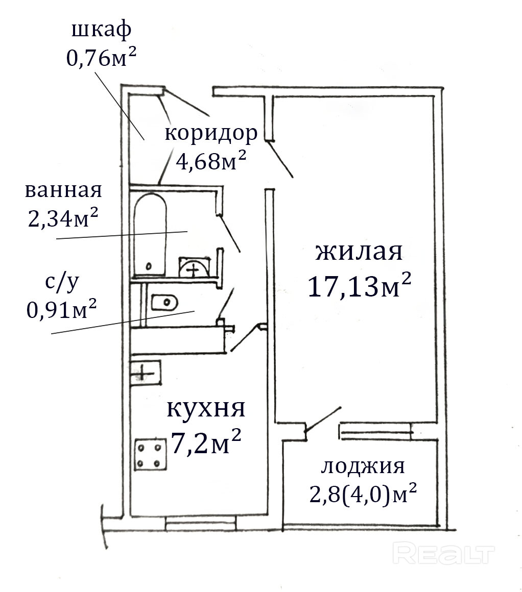 В жилой комнате есть выход на застекленную лоджию. Санузел раздельный. Установлена ванна и подключена стиральная машина.