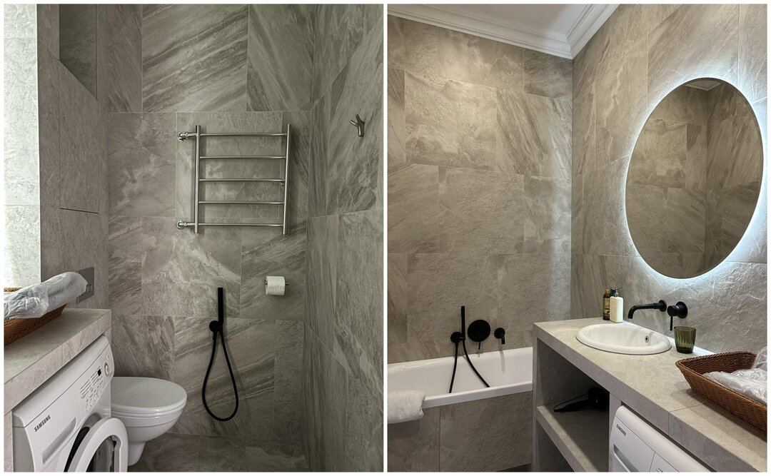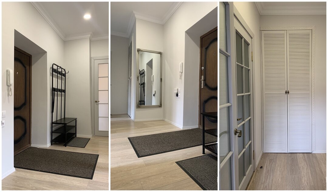 Здесь заменена электропроводка и трубы. Сохранены потолочные изюминки сталинки — высота 3,10 метра, галтели и розетки. Стены окрашены водостойкой краской, на полу лежит ламинат. Все фрески ручной работы.