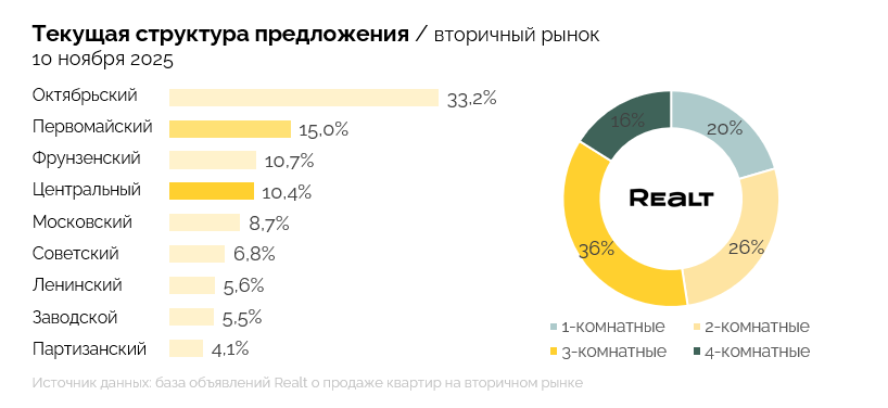 Динамика предложения по всем районам показала разнонаправленные изменения. Существеннее всего это коснулось Заводского района — минус 6%, а также Ленинского района — минус 5%.