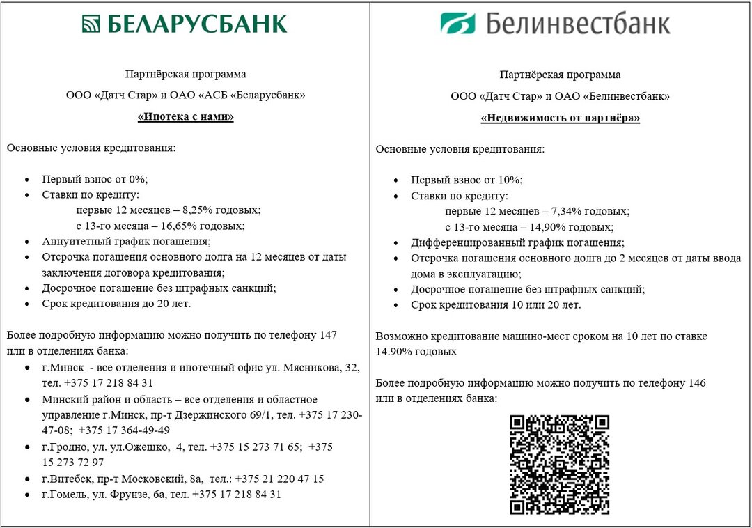 Если говорить подробнее о каждой партнерской программе, то «Белинвестбанк» предлагает кредитование на 10 и 20 лет с возможностью досрочного погашения без штрафных станций. Первый взнос — от 10 процентов.