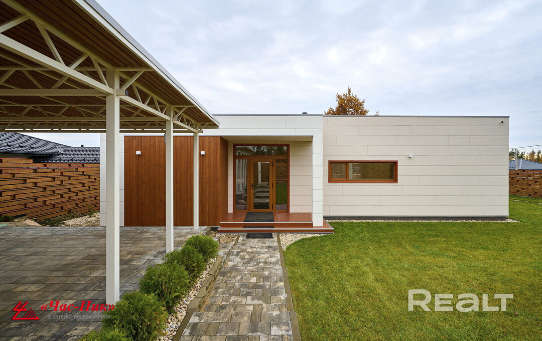 Дом построен по каркасной технологии, но об этом нам ничего не говорит в его внешности — одноэтажный, с плоской крышей, фасадом с облицовкой бетонными плитами и панорамными окнами. И тем не менее, основой строения является именно деревянный каркас. Николай, который занимался проектированием и строительством дома, рассказал, что главная его особенность — технология сборки. Это не просто сбитые гвоздями доски — каркас собран с элементами фрезеровки.