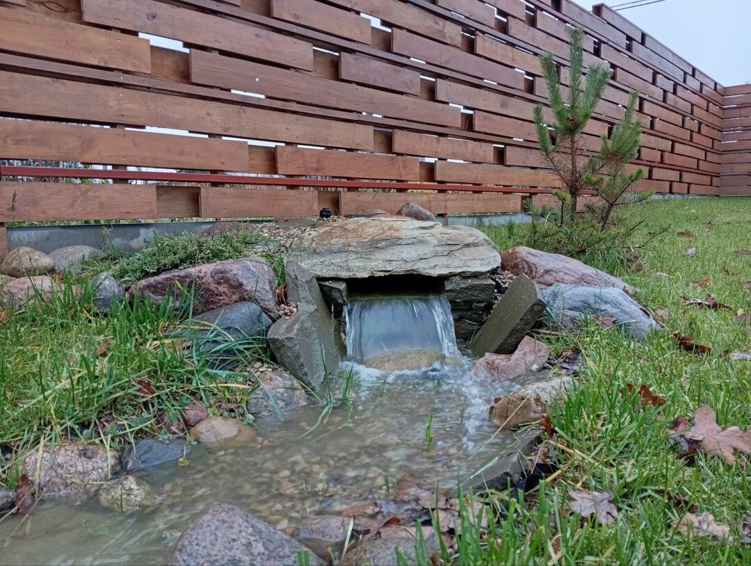 Дом стоит на участке 9 соток, с сохранившимися дубами, которые являются главными природными акцентами ландшафтного дизайна. Здесь же видим реализацию оригинальной задумки — рукотворный ручей, которым можно любоваться с террасы и из окон гостиной. Это серьезное гидрологическое сооружение, между прочим: в скрытой от глаз части находится емкость с водой, насосное оборудование, обеспечивающее циркуляцию воды по руслу этой 30-ти метровой речки.