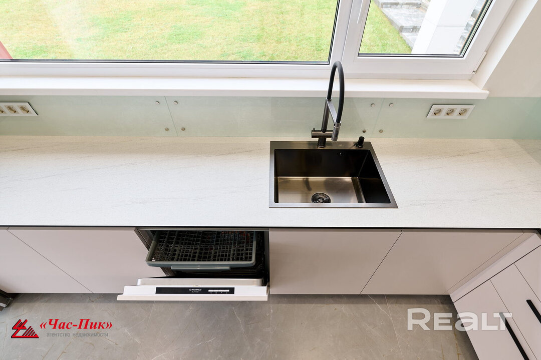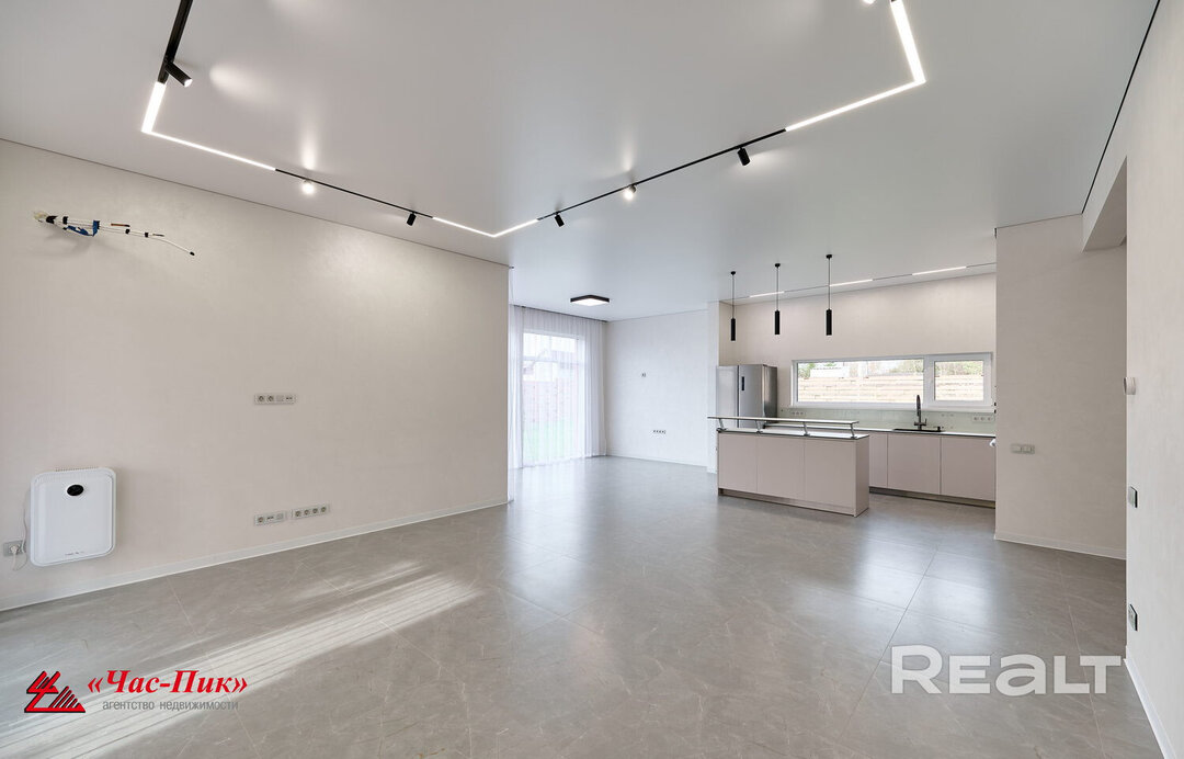Отделку в доме можно назвать нейтральной: светлые стены и полы, белые потолки, корпусная мебель и ноль декора. Почему так? Потому что здесь никто не жил, интерьер можно считать на данный момент универсальным — новый владелец волен внести свои коррективы, обставить комнаты по своему вкусу.