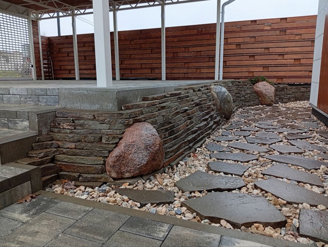 Дом стоит на участке 9 соток, с сохранившимися дубами, которые являются главными природными акцентами ландшафтного дизайна. Здесь же видим реализацию оригинальной задумки — рукотворный ручей, которым можно любоваться с террасы и из окон гостиной. Это серьезное гидрологическое сооружение, между прочим: в скрытой от глаз части находится емкость с водой, насосное оборудование, обеспечивающее циркуляцию воды по руслу этой 30-ти метровой речки.