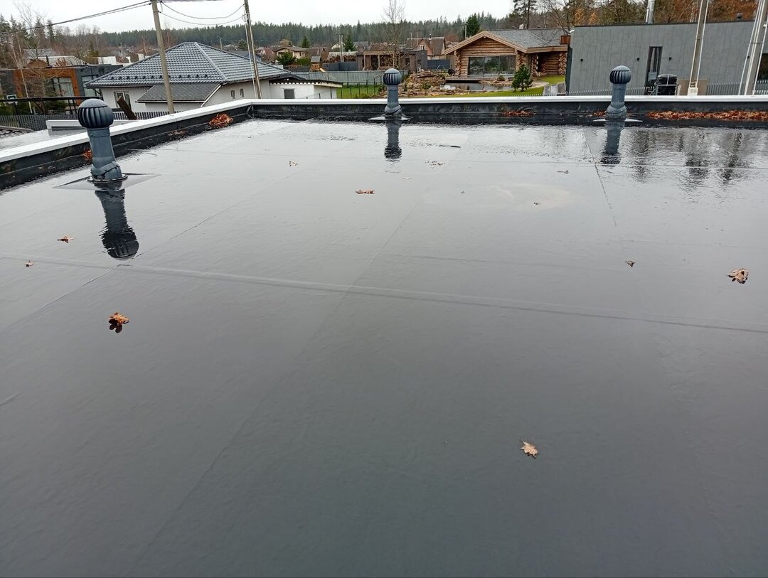 Для плоской крыши использовалась и сверхнадежная кровля — мембрана Firestone. Это дорогое, но долговечное решение с гарантией до 50 лет, которое позволяет настелить крышу бесшовно.