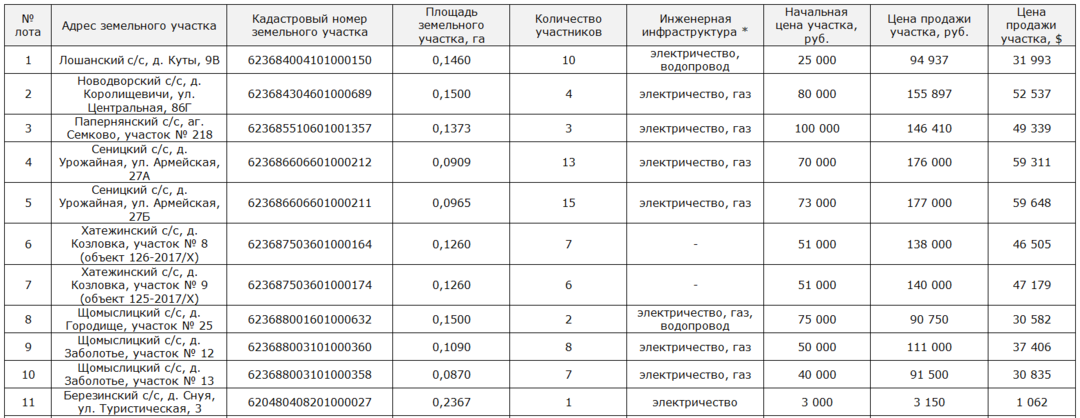 Щомыслицкий сельсовет выставлял на аукцион 3 участка, один из них в деревне Городище и 2 — в деревне Заболотье. Все земельные наделы газифицированные. Больше всего заявок — 8 — подали на участок № 12 в д. Заболотье. При начальной цене 50 000 рублей лот продали за 111 000 рублей, или 37 406 долларов.