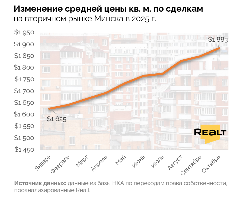 За октябрь цены сделок показали прирост в 2% или +35 $ на квадратный метр — с 1 848 $ до 1 883 $. А совокупно с начала года увеличение цен сделок составило в среднем +18% или +285 $/кв.м.
