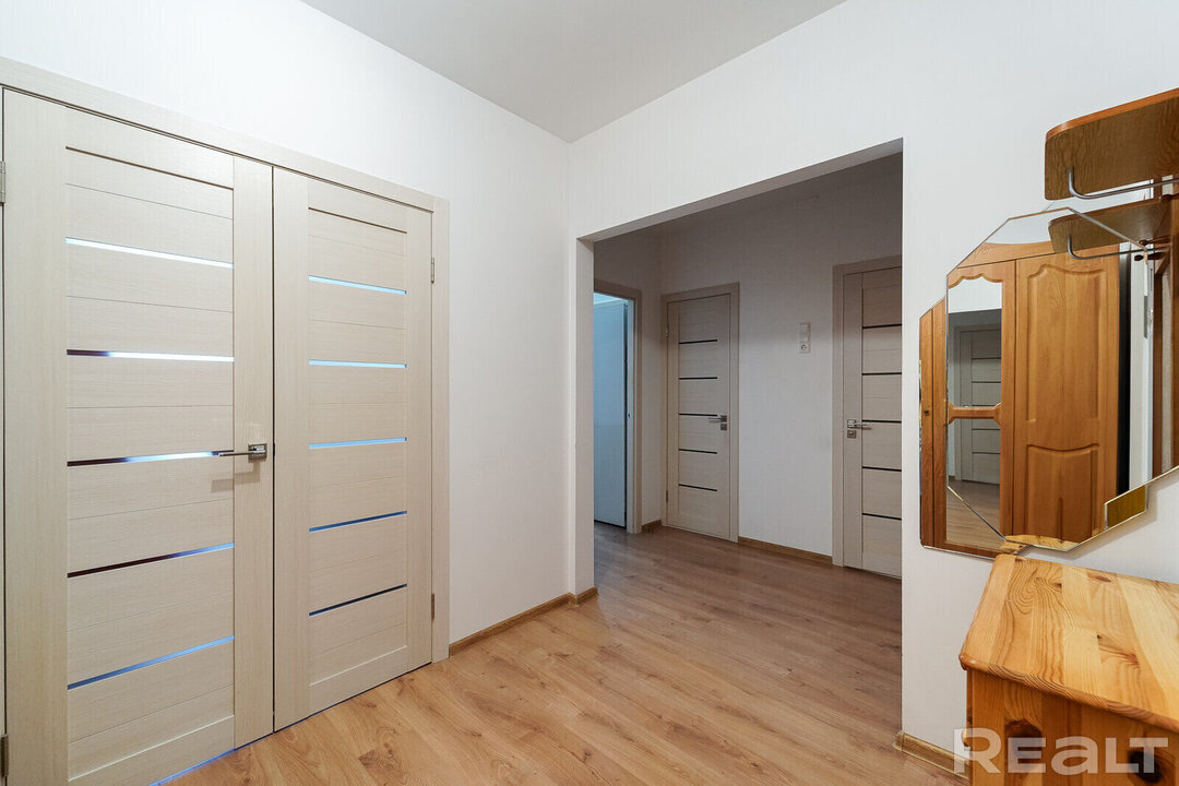 Квартира выглядит аккуратной: светлые стены, на полу лежит теплый оттенок ламината. Владельцы готовы оставить мебель, но по желанию покупателя она может быть вывезена. Пространства получились просторными. В коридоре можно организовать несколько зон для хранения вещей. Из кухни имеется выход на застекленный балкон.
