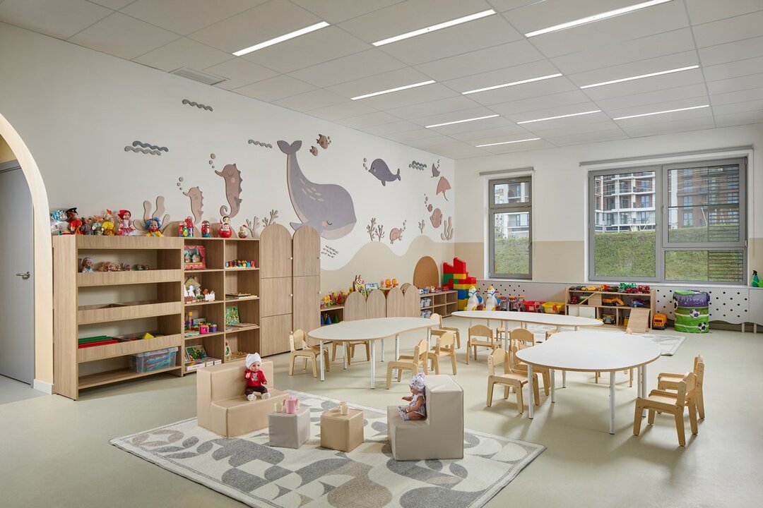 «Серебряный кит» стал первым дошкольным учреждением «Северного Берега» и открывает масштабную программу по развитию социальной инфраструктуры района. Всего в комплексе планируется построить 17 детских садов и 12 школ.