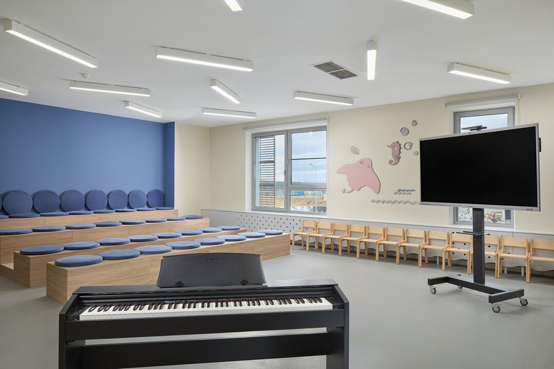 Для занятий, творчества и активного досуга в детском саду созданы большие функциональные пространства: музыкальный зал площадью 92 квадрата и полностью оснащенный спортзал на 100 квадратов. Также тут предусмотрена своя мультстудия, где дети смогут собрать свой мультфильм — из пластилина, глины, конструктора и любого материала.