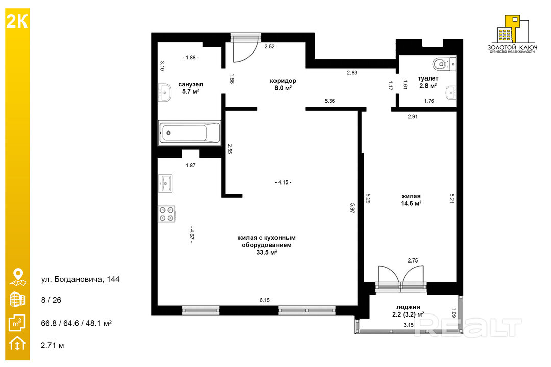 Один метр в однушке стоит 2 135 долларов, за жилье нужно заплатить 67 900 долларов.