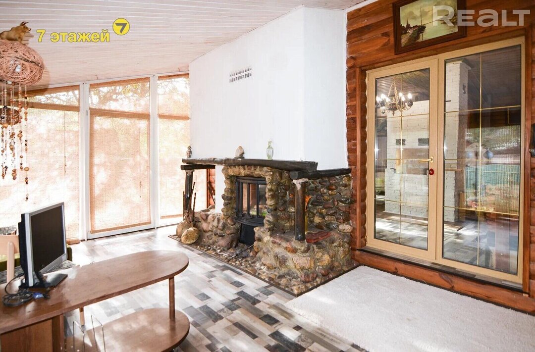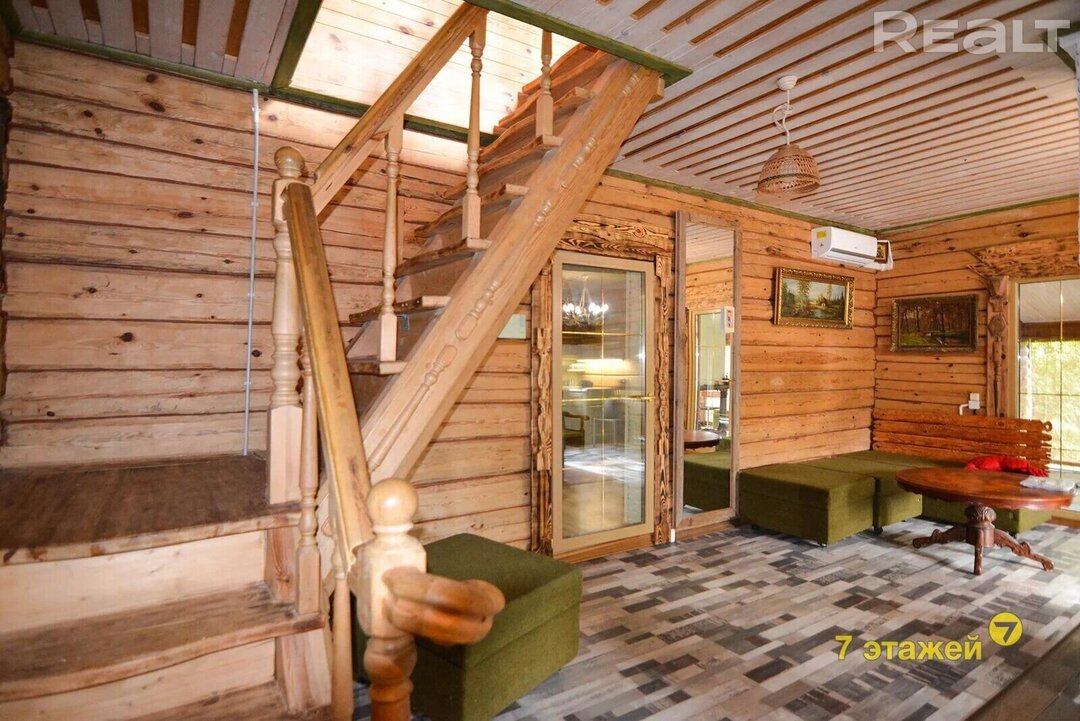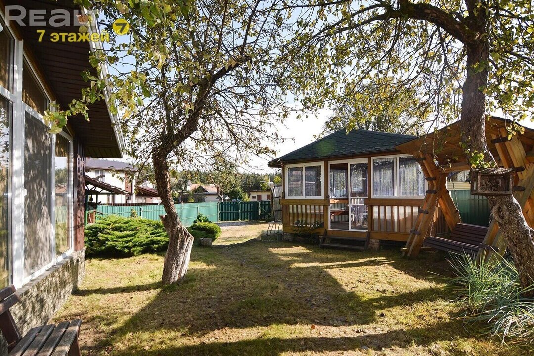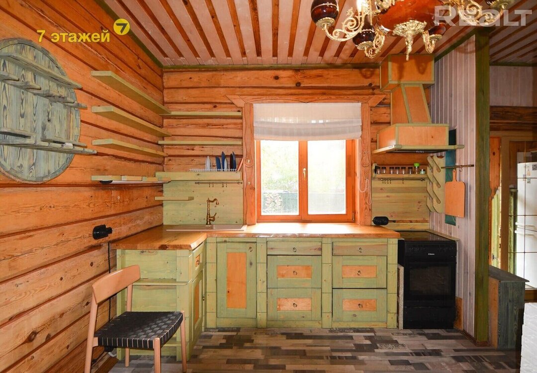 Здесь на продажу выставили деревянный двухэтажный дом, подготовленный для круглогодичного использования. Это современное строение — окна ПВХ, на крыше — битумная черепица, застекленная веранда и терраса с печкой-барбекю.