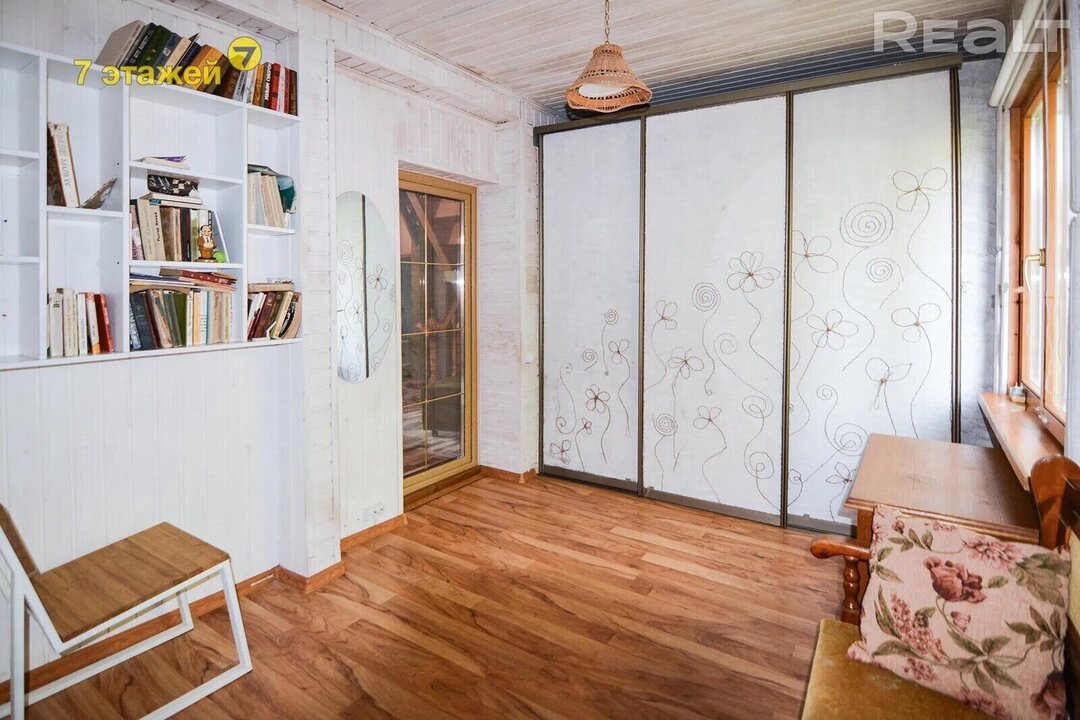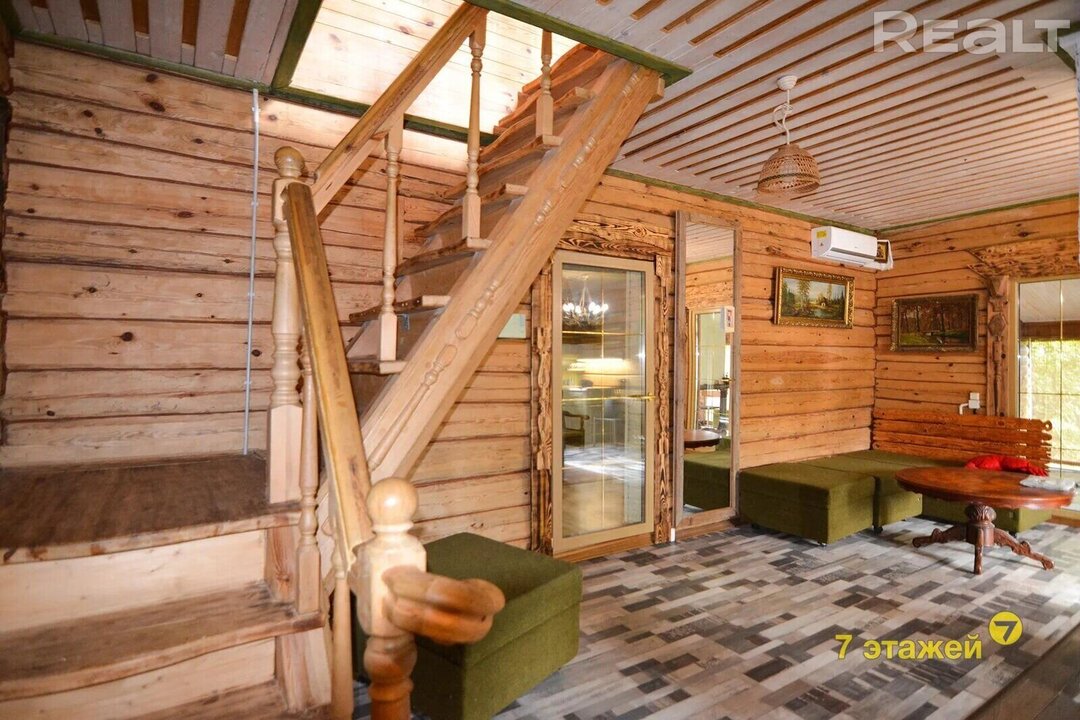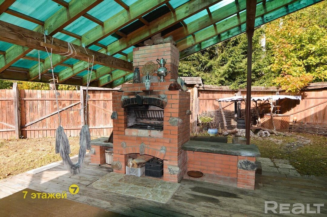 Здесь на продажу выставили деревянный двухэтажный дом, подготовленный для круглогодичного использования. Это современное строение — окна ПВХ, на крыше — битумная черепица, застекленная веранда и терраса с печкой-барбекю.