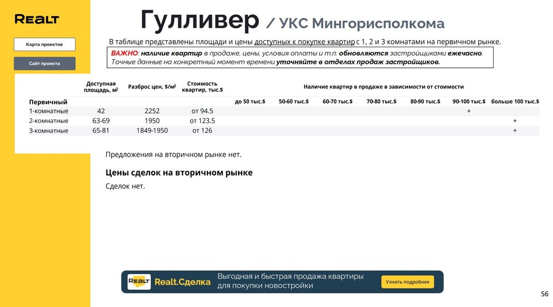 Сейчас в обзоре собраны предложения по 27 ЖК. Каждому жилому комплексу посвящено несколько страниц с ценами на первичке и на вторичке. Вот как выглядит один из слайдов для одного из ЖК в обзоре: