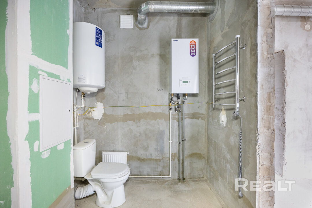 В четырехкомнатной квартире в настоящий момент все готово к чистовой отделке. Тут уже разведена электрика, оштукатурены стены, выровнен пол, залита стяжка, установлен бойлер, унитаз и электрический котел.