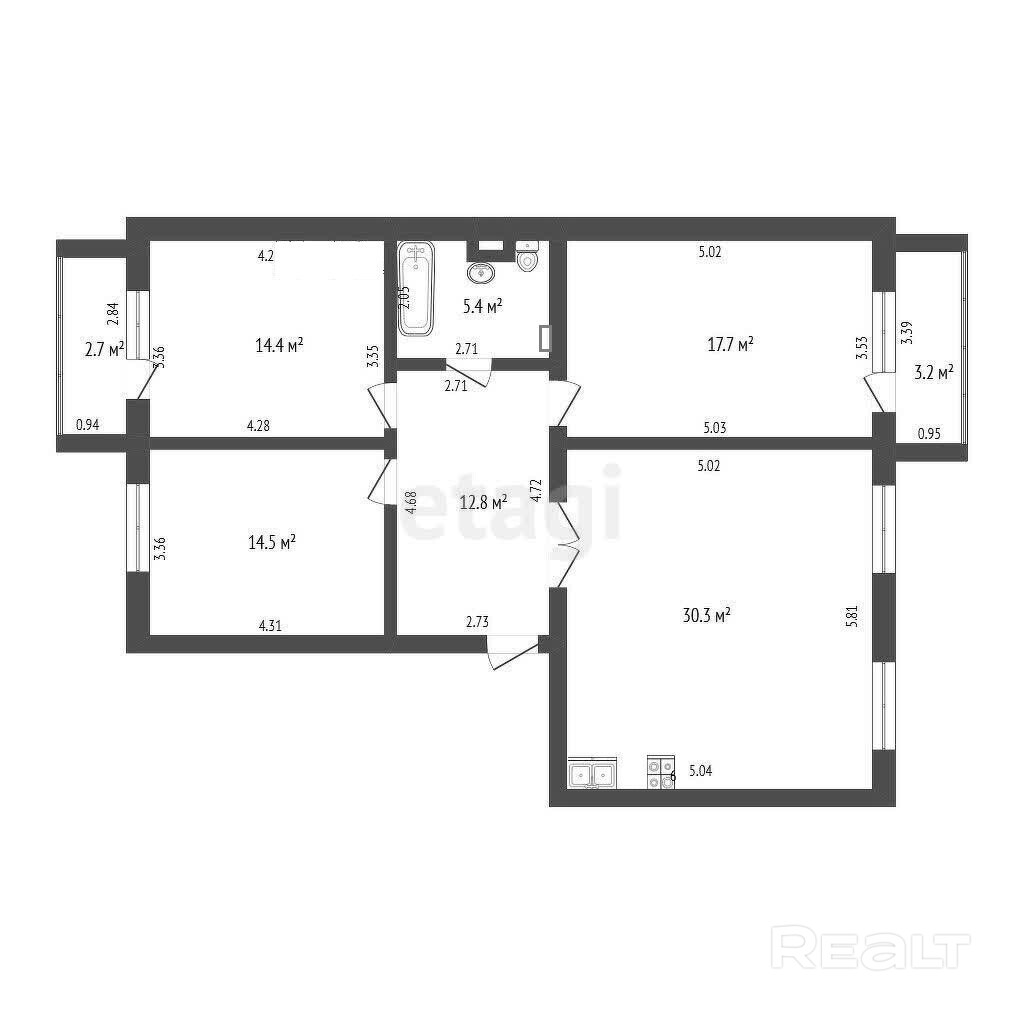 Квартира состоит из вместительной кухни-гостиной (30 квадратов) и сразу трех жилых комнат. В ней предусмотрен один санузел и две лоджии. Благодаря функциональной планировке с окнами на разные сторон, выделенную площадь можно зонировать абсолютно по-разному — создать общие пространства для отдыха или выделить отдельные комнаты для каждого члена семьи.