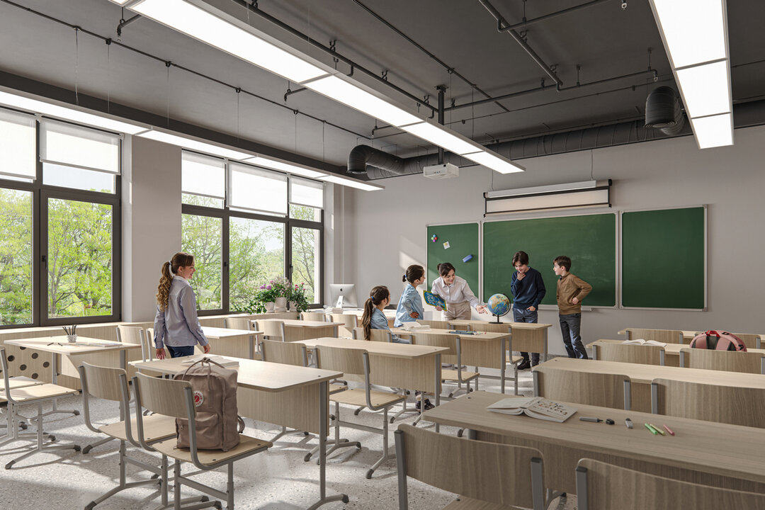 На пришкольной территории разместятся две волейбольные и баскетбольная площадки, а также открытая воркаут зона. Полноразмерный футбольный стадион с круговым беговым треком и трибунами для болельщиков станет местом проведения школьных спортивных турниров.