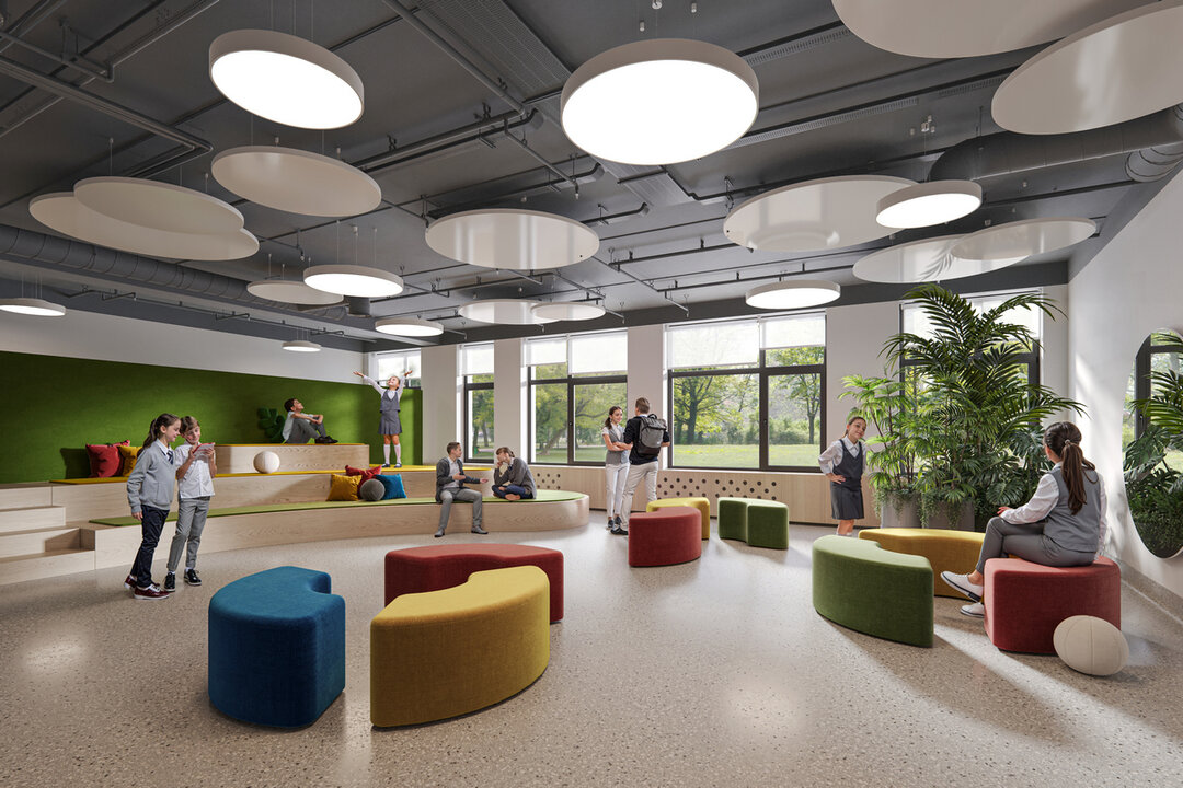 — Пока что мы не предлагаем никакой супер-графики на стенах. Хочется вместо этого наполнять интерьер интересными мебелью, материалами, светильниками, не перегружая его визуально. В моем представлении, школьная среда должна быть только фоном для детей, которые уже сами будут решать, чем там заниматься в свободное время, — говорит архитектор проектной организации «Минскгражданпроект» Юлия Лыгина. — Единственное, в рекреациях хотелось дать подсказки. Например, для начальных классов мы предложили сделать импровизированную сцену или подиум. Малышей заинтересует специально выделенная площадка для совместной игры. Они смогут ставить сценки для себя, для родителей, устраивать инсталляции и выставки рисунков.
