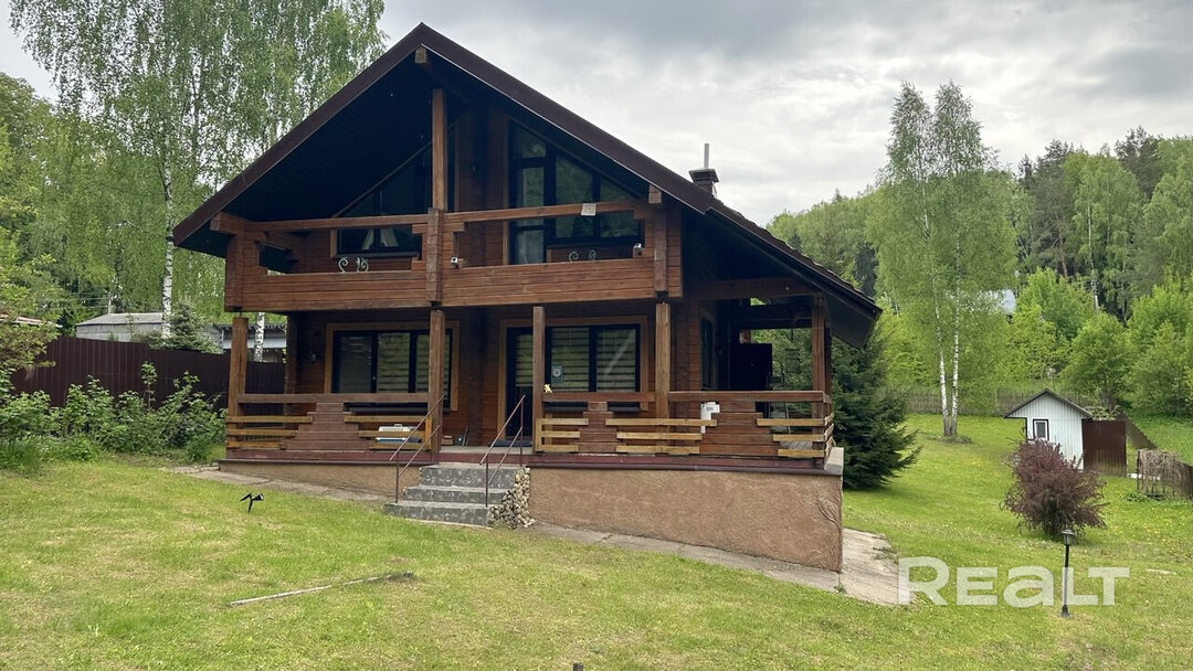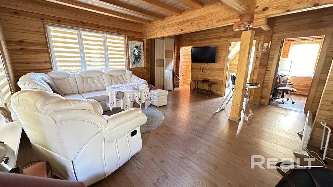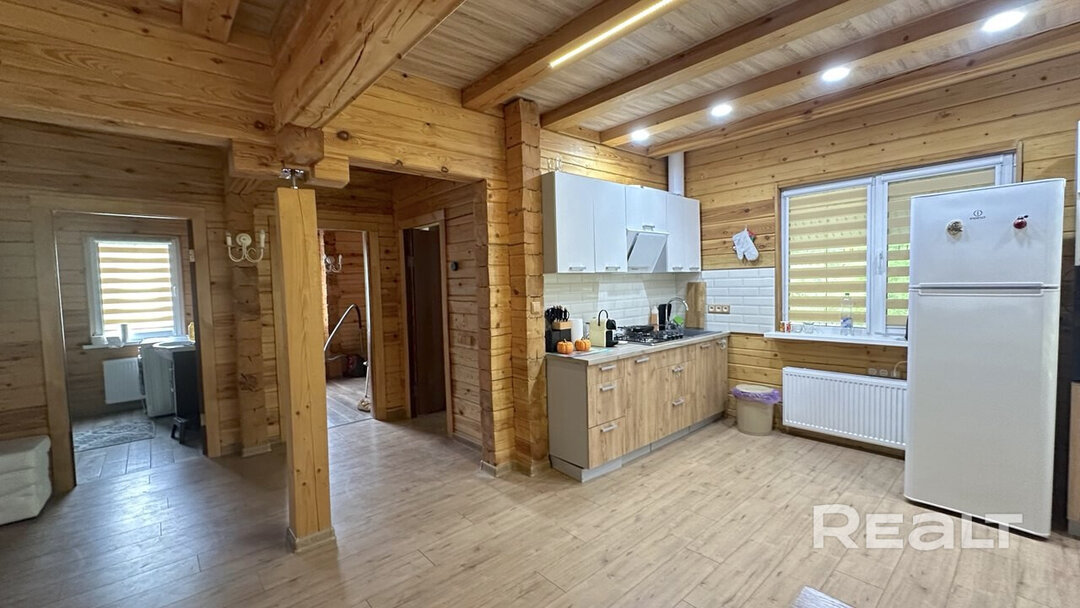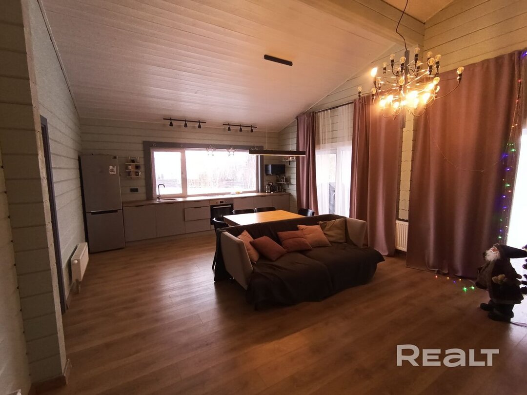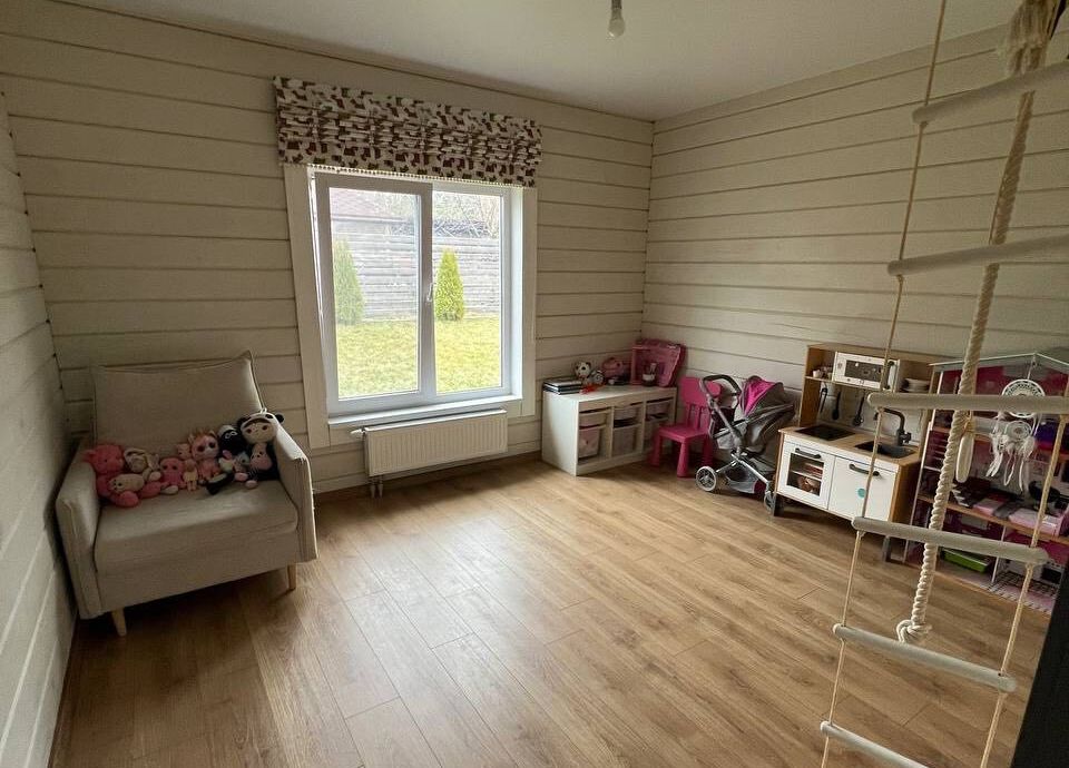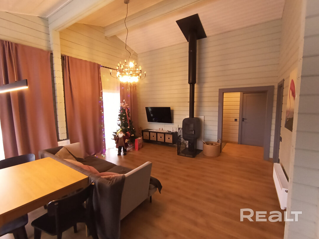 Дом деревянный, из профилированного бруса, построен в 2016 году. Накрыт немецкой черепицей. Общая площадь — 106 м2. Максимально рациональная и продуманная планировка: огромная гостиная со вторым светом и высотой потолка больше 6 метров, кухня, две отдельные комнаты, санузел, топочная, кладовая-постирочная, прихожая.
