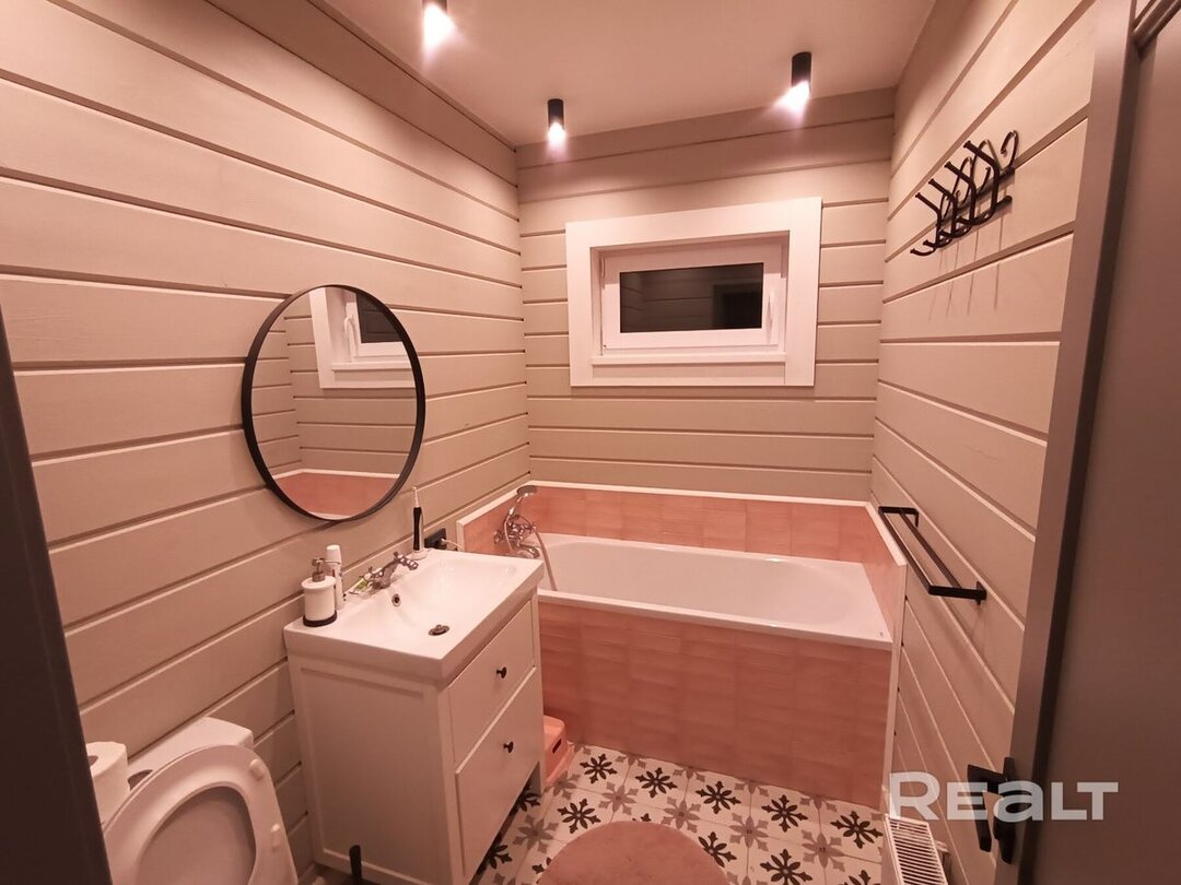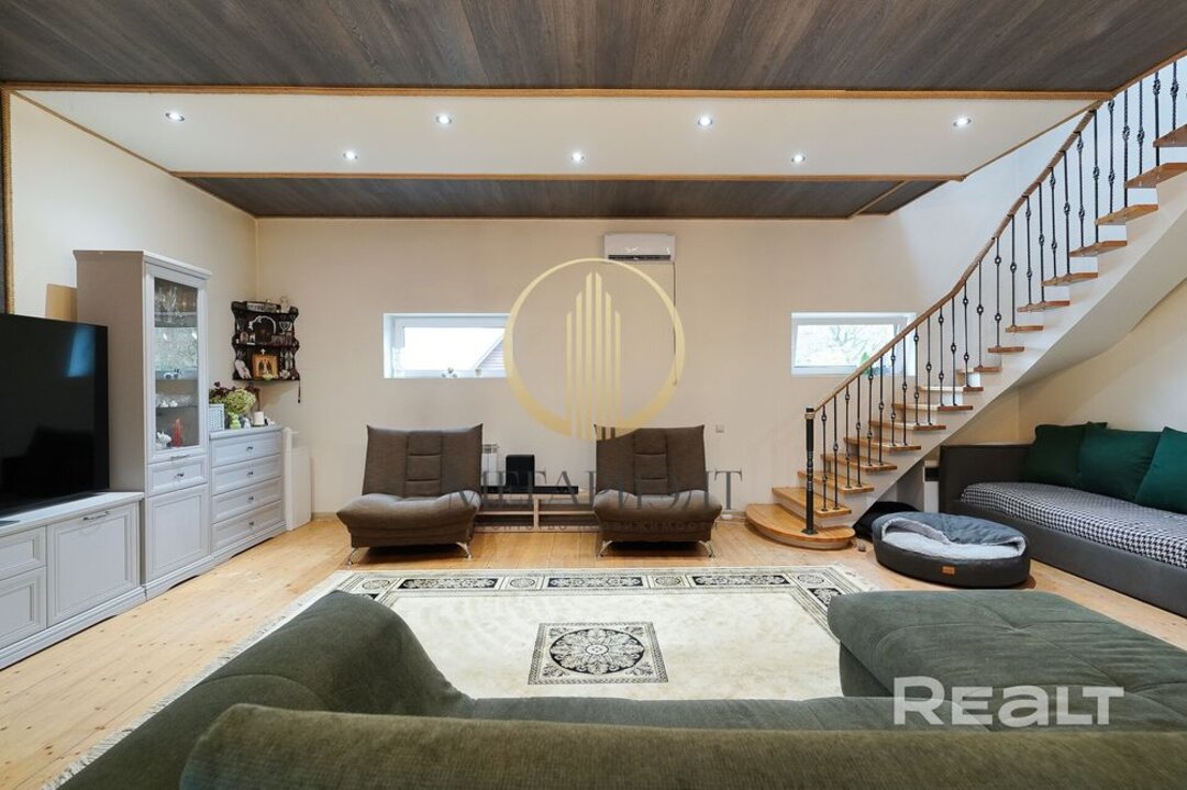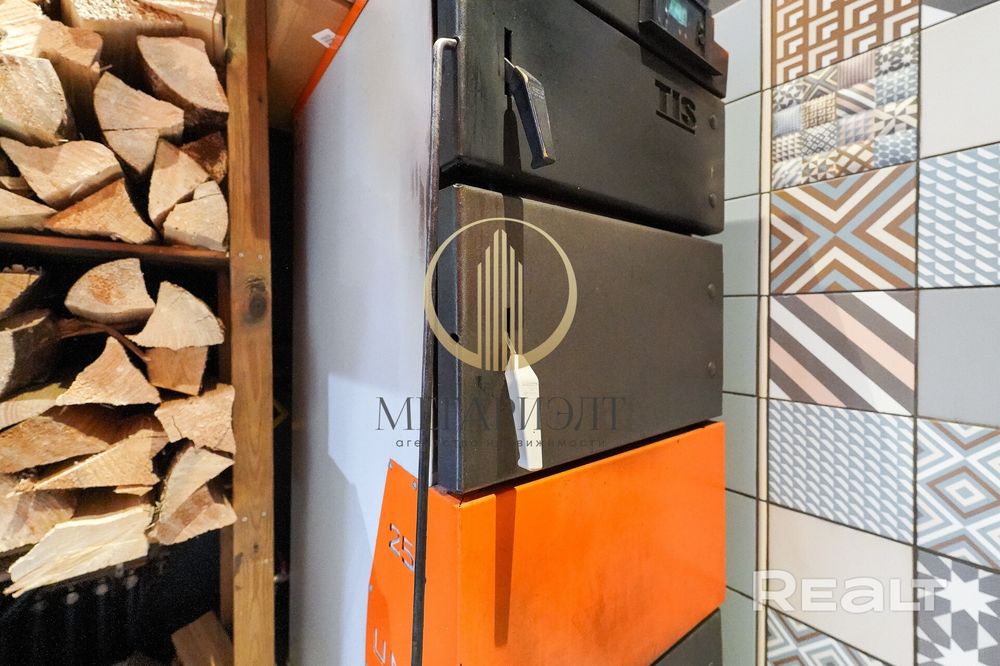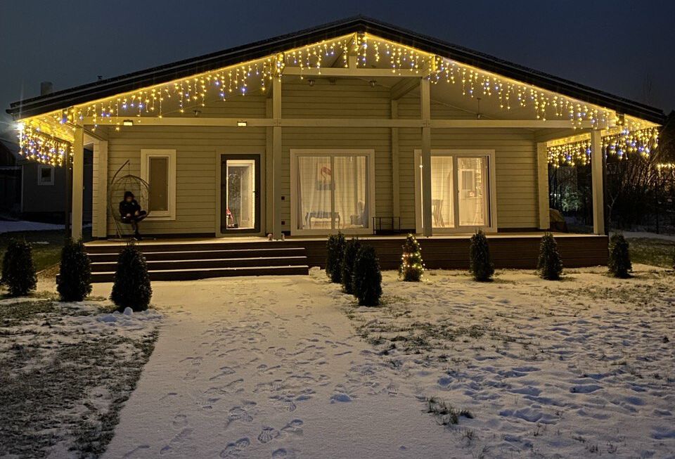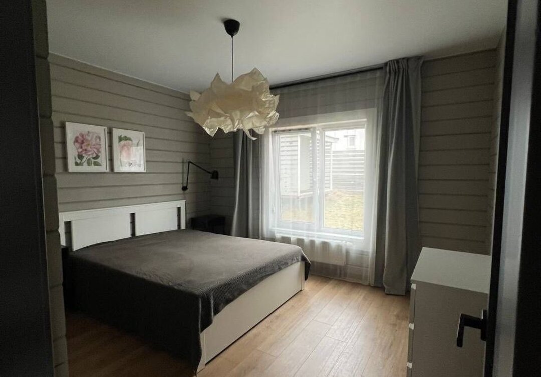 Дом деревянный, из профилированного бруса, построен в 2016 году. Накрыт немецкой черепицей. Общая площадь — 106 м2. Максимально рациональная и продуманная планировка: огромная гостиная со вторым светом и высотой потолка больше 6 метров, кухня, две отдельные комнаты, санузел, топочная, кладовая-постирочная, прихожая.