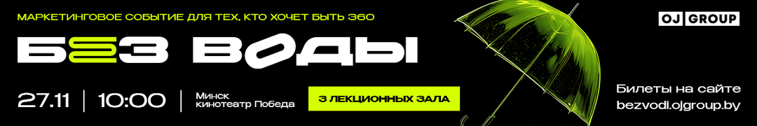 Билеты уже доступны на сайте bezvodi.ojgroup.by. «Без воды» — это конференция, которая возвращает маркетинг к сути. Минск, 27 ноября. Кинотеатр «Победа». И все разговоры — без воды.