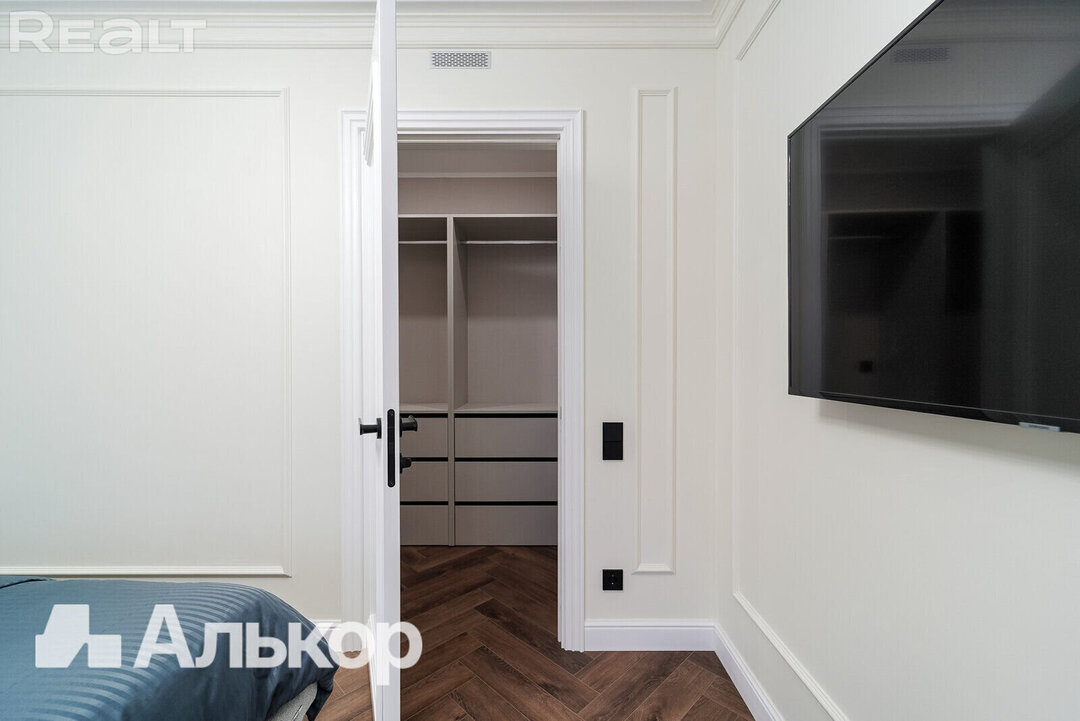 Изолированную комнату заняла спальня. Из нее имеется выход в гардеробную. Кстати, их в квартире две. Для верхней одежды и обуви выделили квадраты около входа.