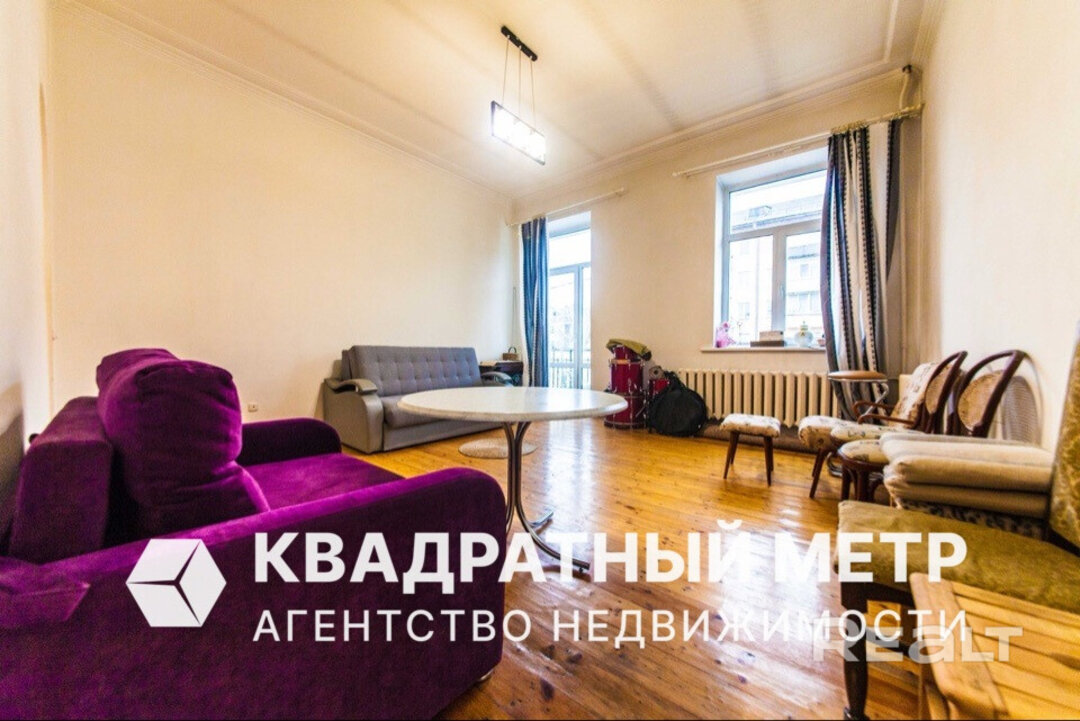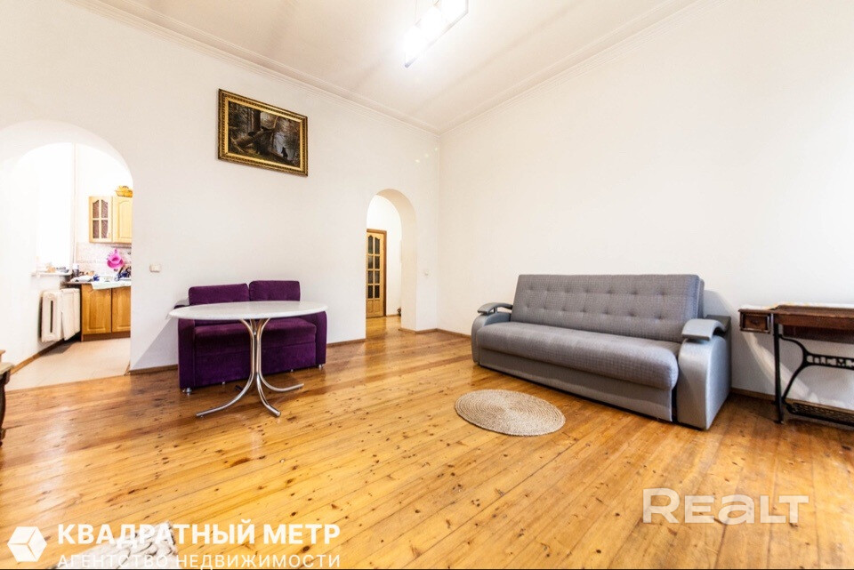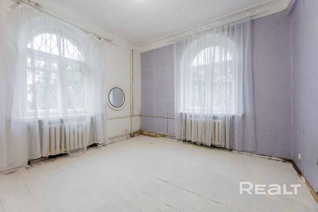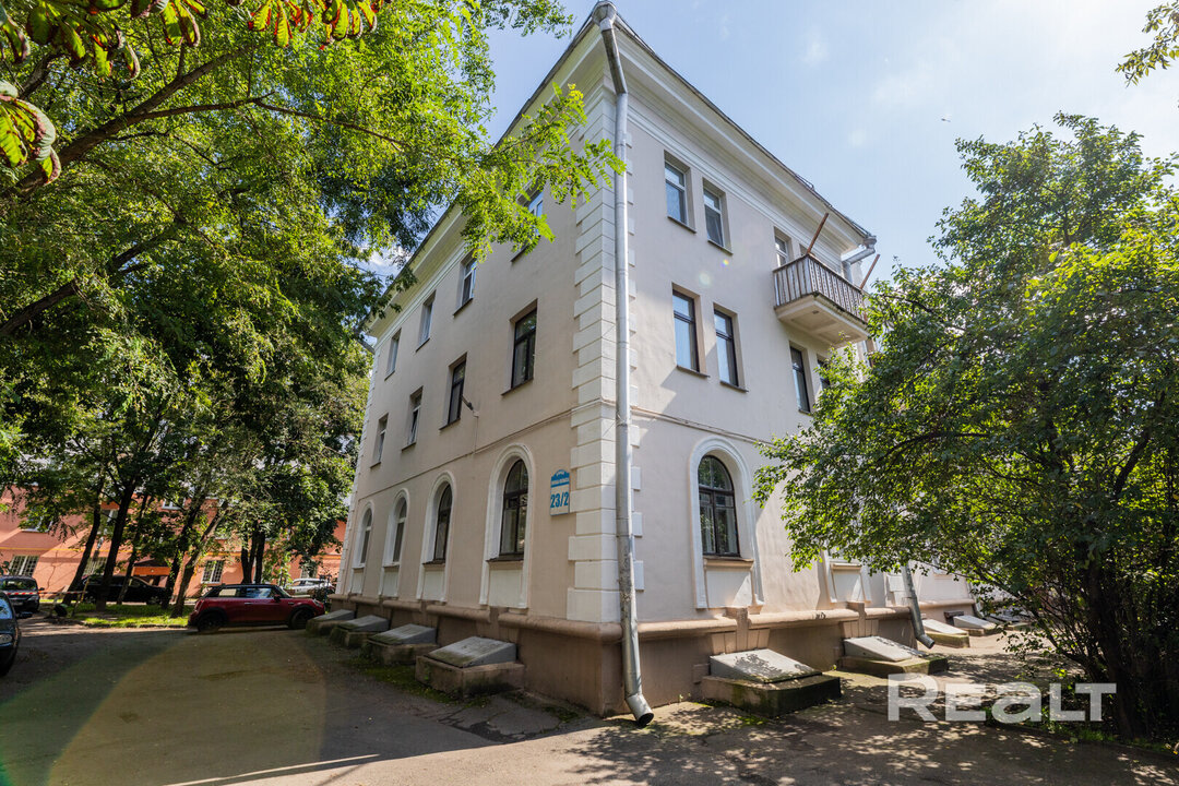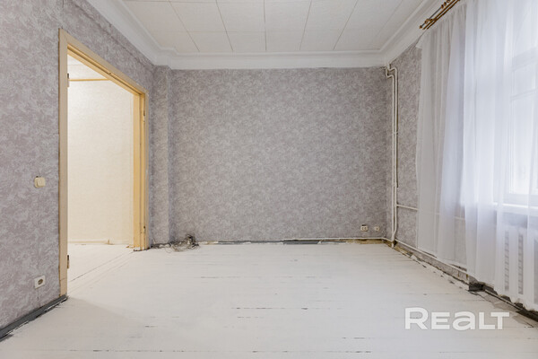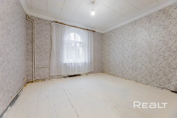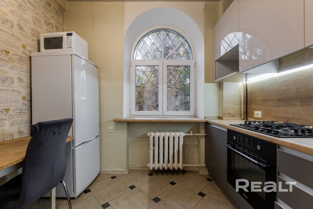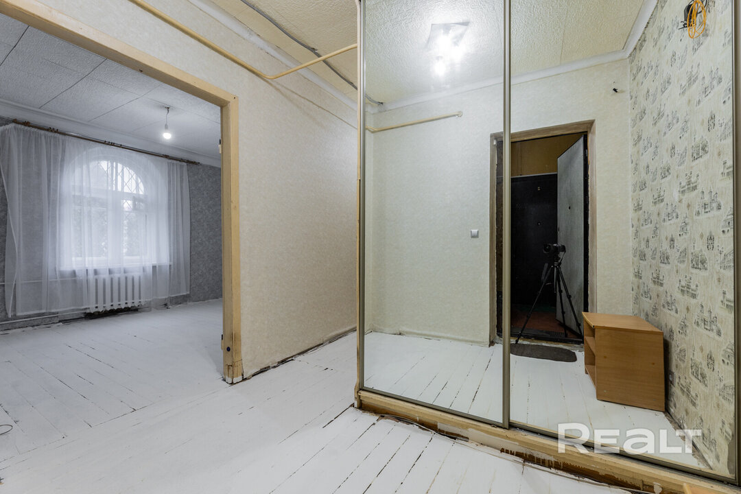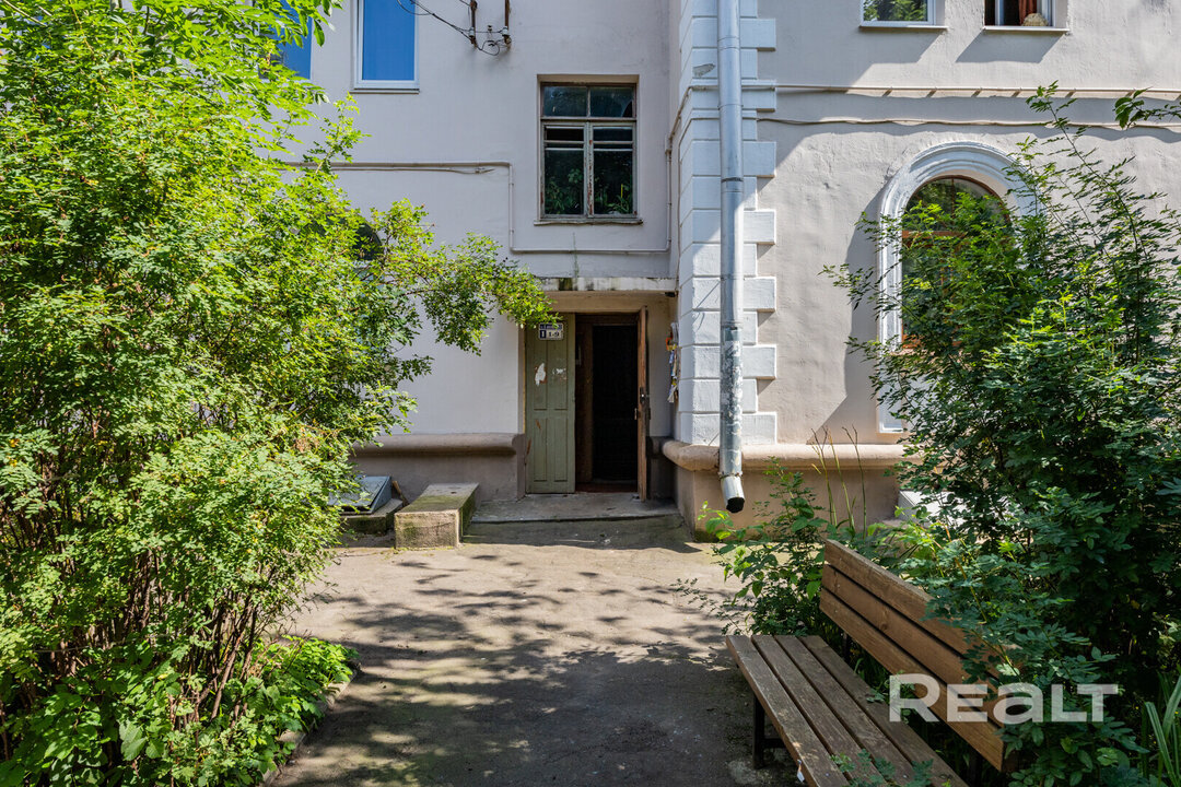Самый дешевый вариант нашей подборки — двухкомнатная квартира под ремонт в аутентичной сталинке. Это вариант для тех, кто любит уютные дворы и арочные окна. Двушка находится на первом этаже трехэтажного дома на улице Якуба Коласа, 23 корпус 1. До станции метро «Академия наук» чуть меньше километра или около десяти минут пешком. Столько же и до станции «Площадь Якуба Коласа».