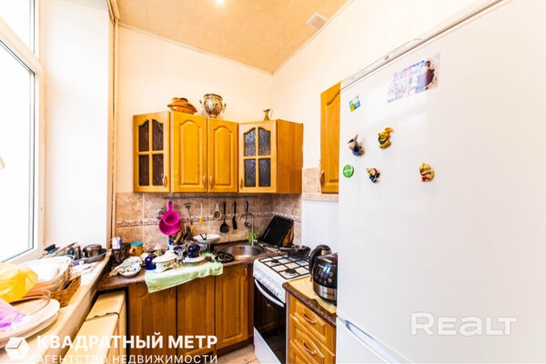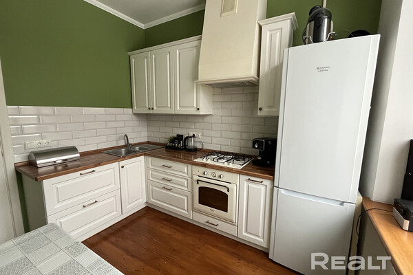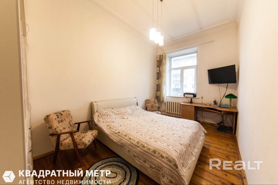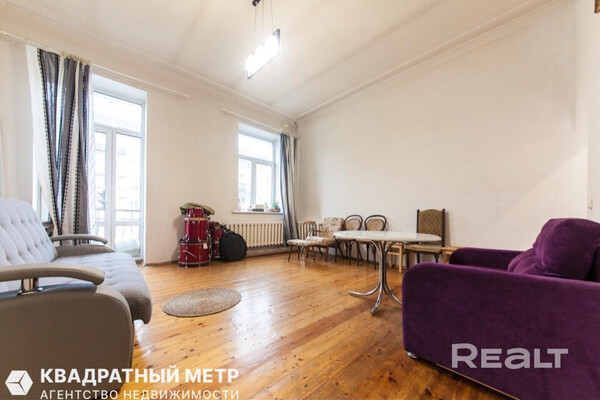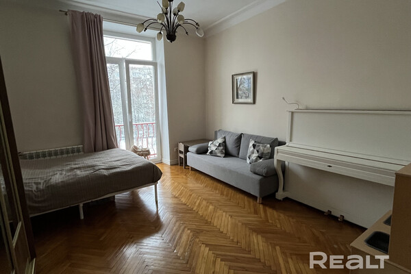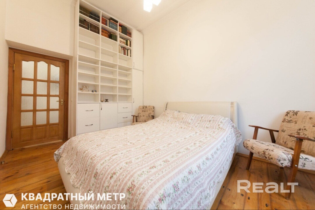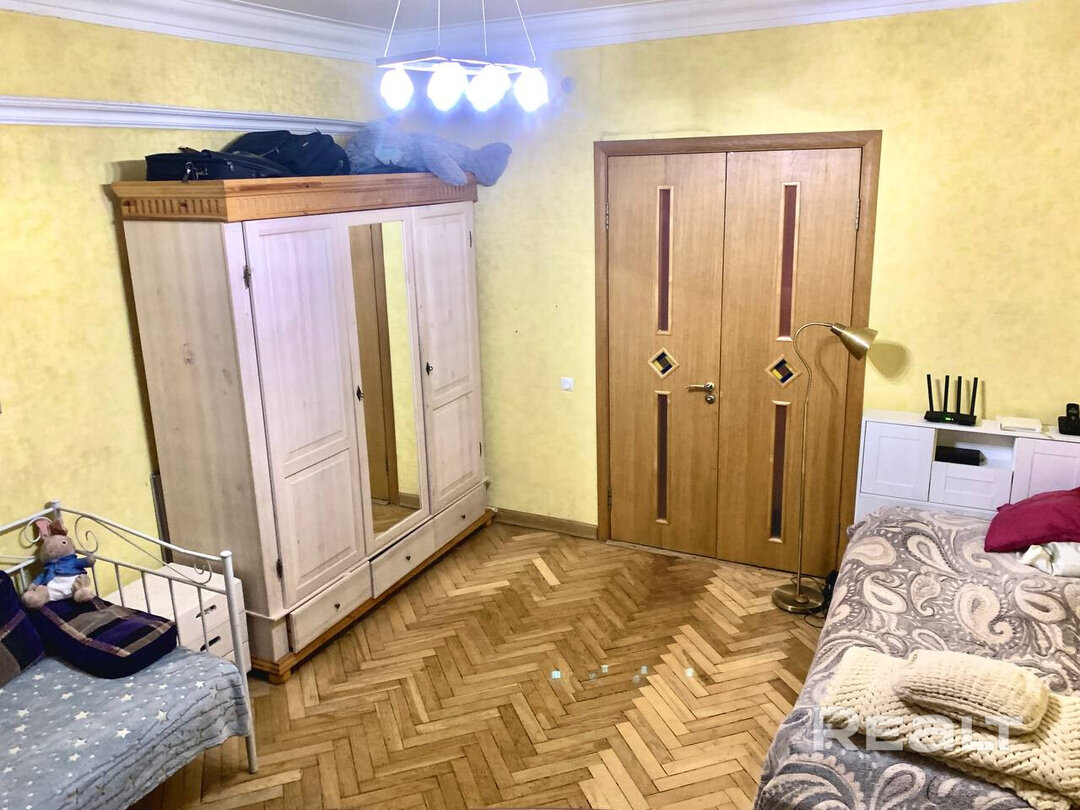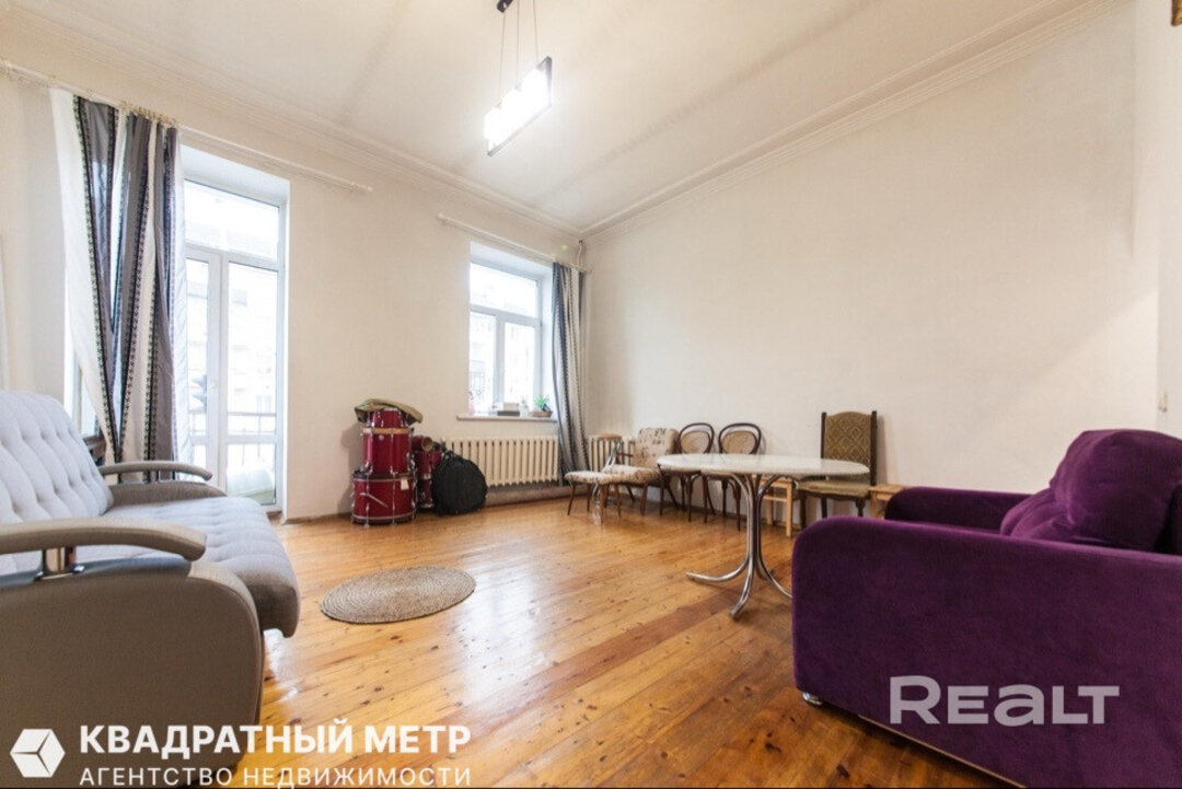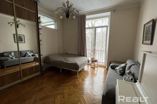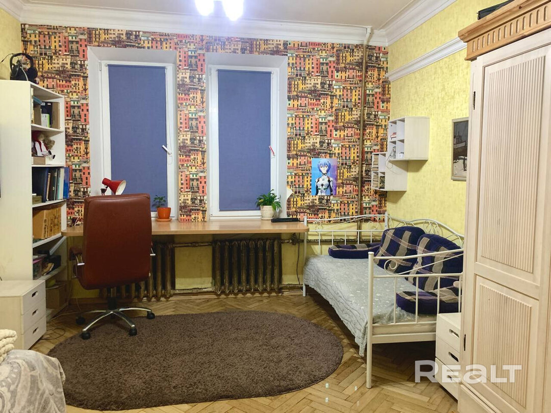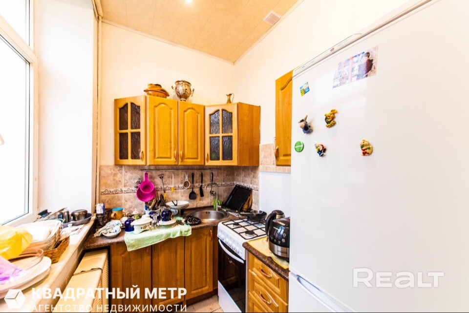 Самый дешевый вариант нашей подборки — двухкомнатная квартира под ремонт в аутентичной сталинке. Это вариант для тех, кто любит уютные дворы и арочные окна. Двушка находится на первом этаже трехэтажного дома на улице Якуба Коласа, 23 корпус 1. До станции метро «Академия наук» чуть меньше километра или около десяти минут пешком. Столько же и до станции «Площадь Якуба Коласа».