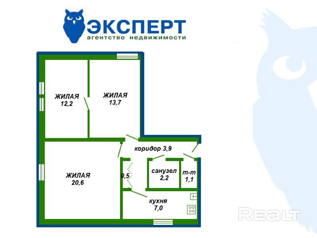В большой жилой комнате есть выход на балкон. Санузел раздельный. Вот как выглядит квартира.