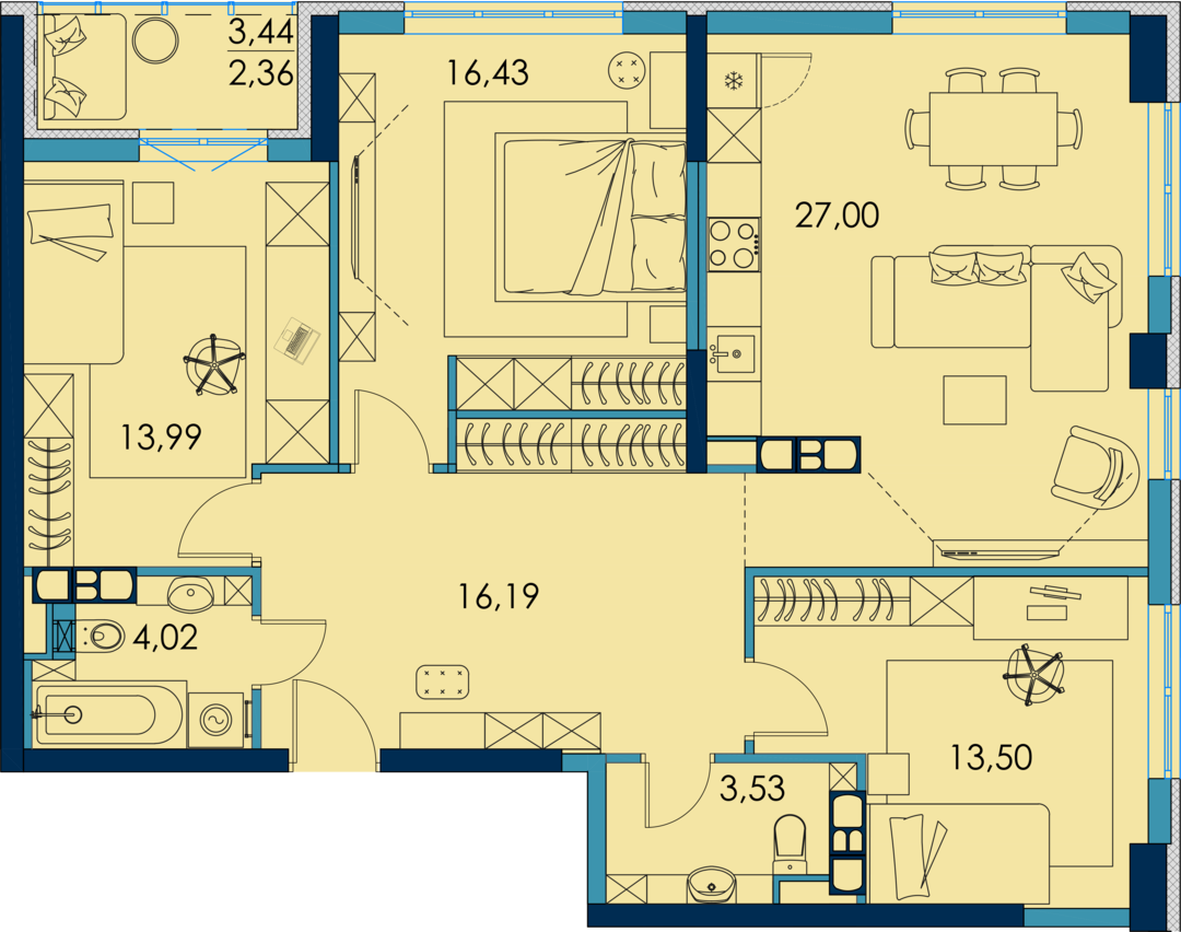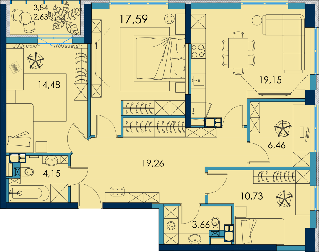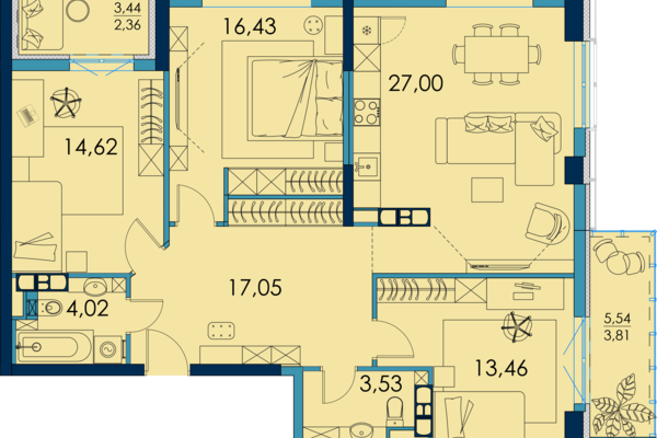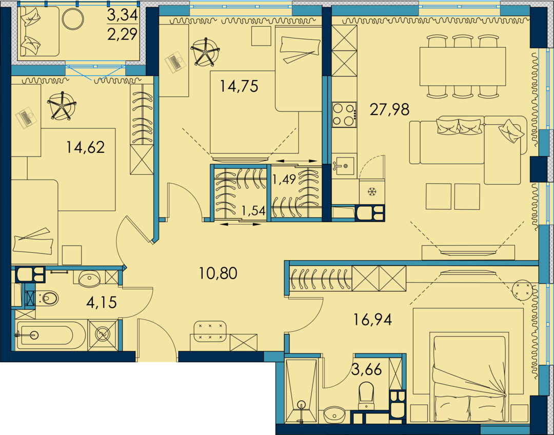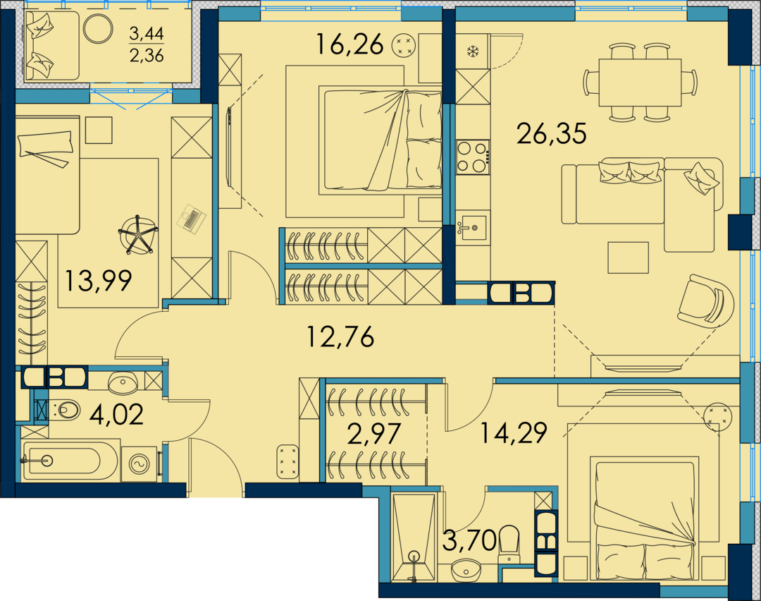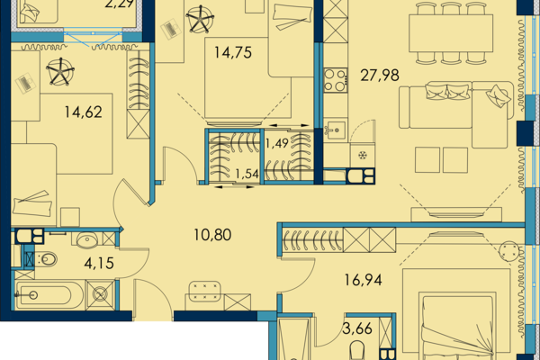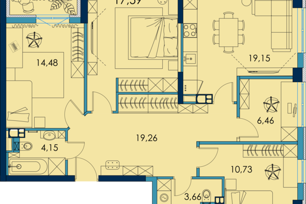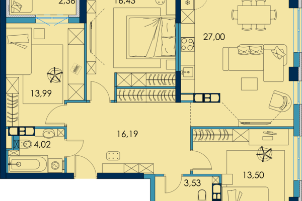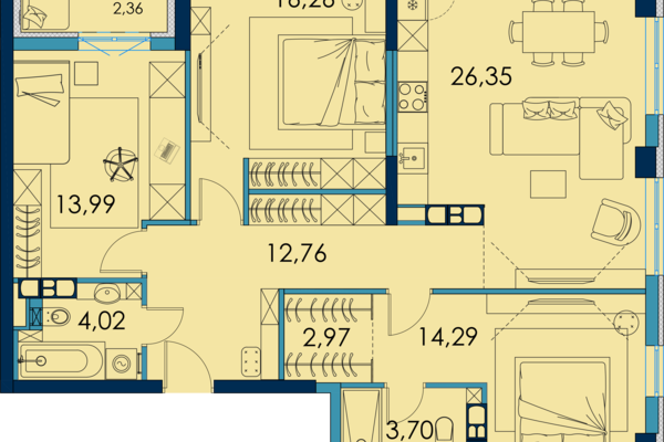 Особый интерес для семей представляют трехкомнатные квартиры площадью 98-101 кв. м. Их планировочные решения можно назвать ключевым преимуществом.