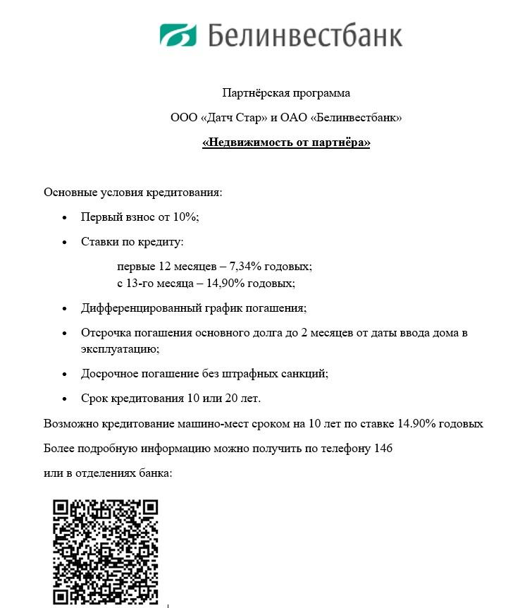 Покупатели могут воспользоваться программой банка-партнера «Белинвестбанк» без увеличения стоимости: