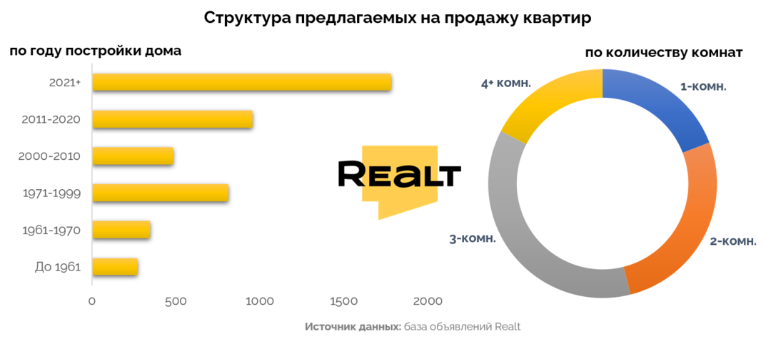 На втором месте, со значительным отставанием от лидера располагаются современные дома 2011−2020 гг. (21%). А на третьем с 17% всех квартир находятся типовые девятиэтажки 1970−1990 гг. постройки.