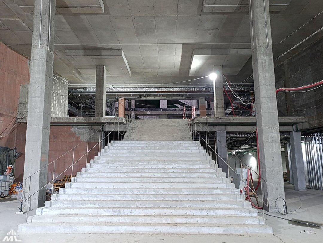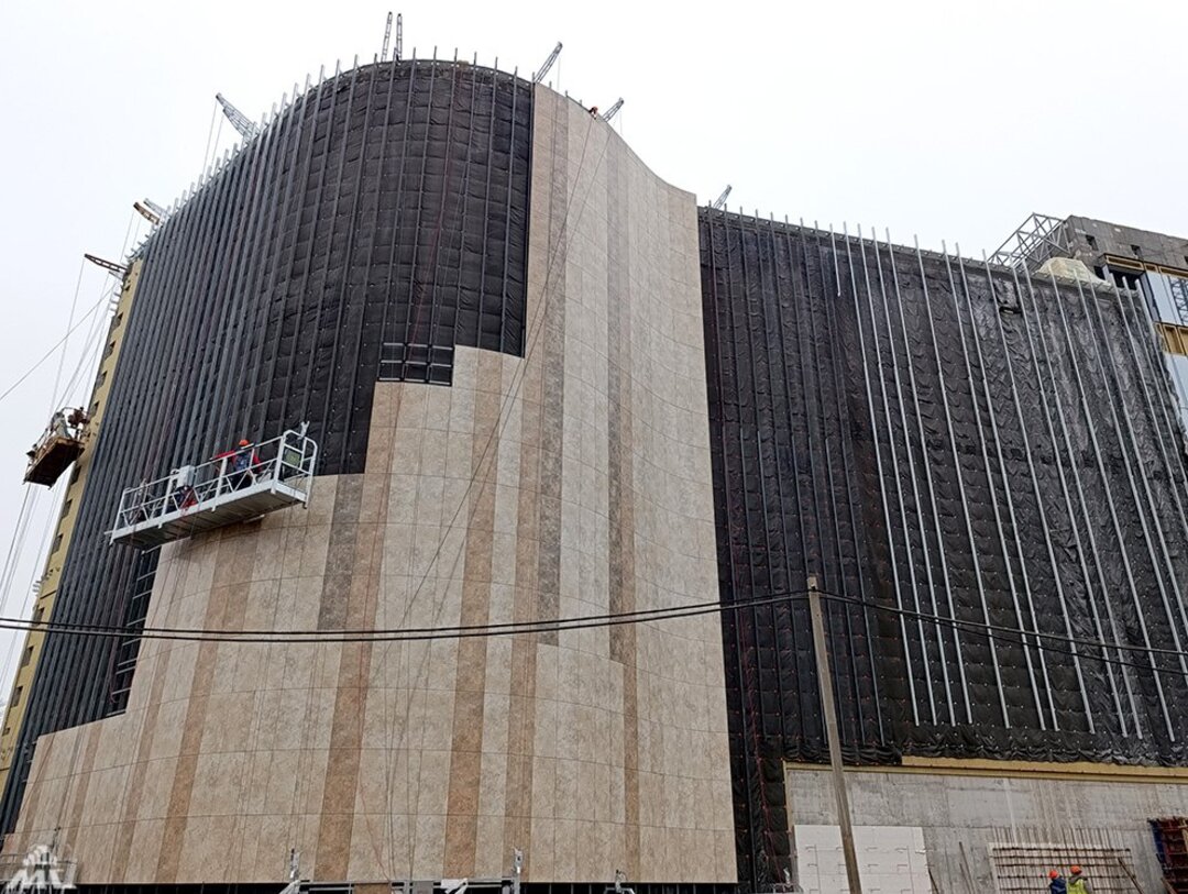 Наполовину выполнено утепление здания, его облицовывают керамогранитом и монтируют витражи. Ведутся также кровельные работы.