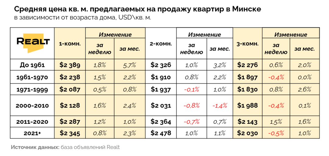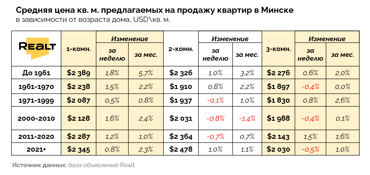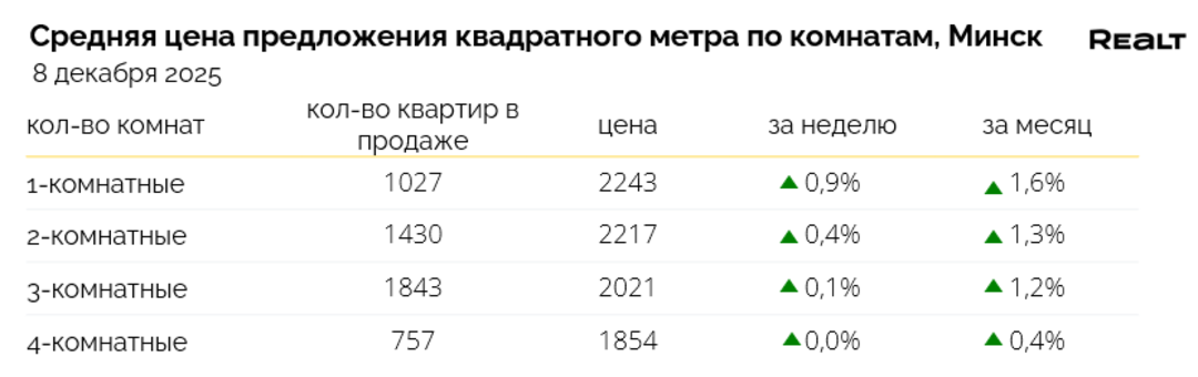 Брест — 1156 $/м2 (+0.3%), Витебск — 904 $/м2 (+0.1%), Гомель — 990 $/м2 (-0.2%), Гродно — 1078 $/м2 (+0.1%), Могилев — 1016 $/м2 (-0.6%).