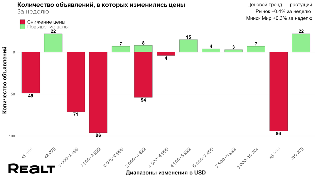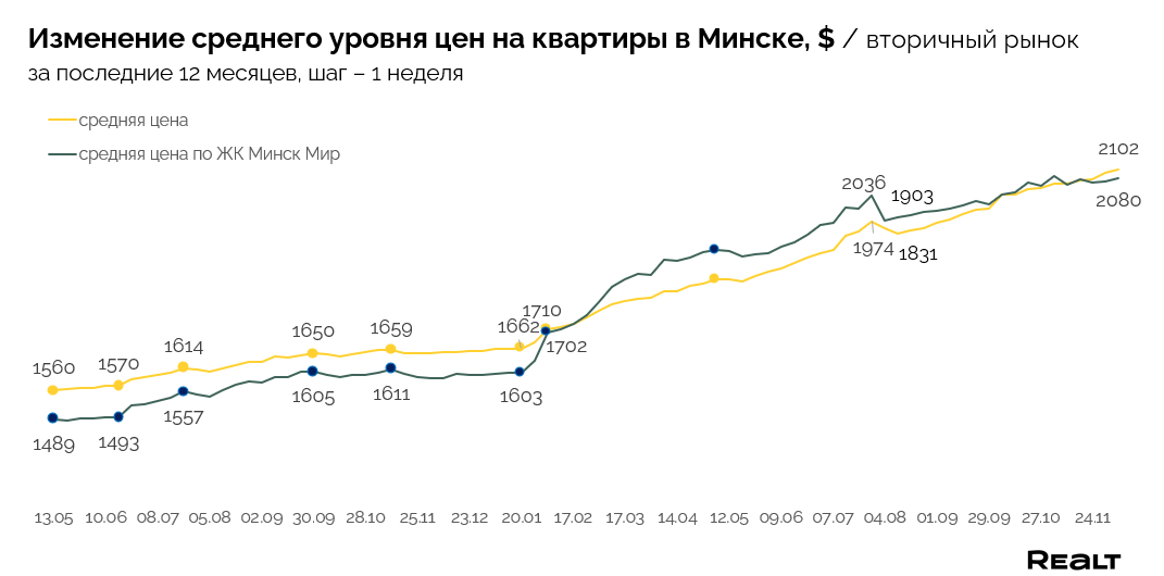 Стоимость квадрата в Минск-Мире также немного подорожала — плюс 0.3%, и достигла 2080 долларов.