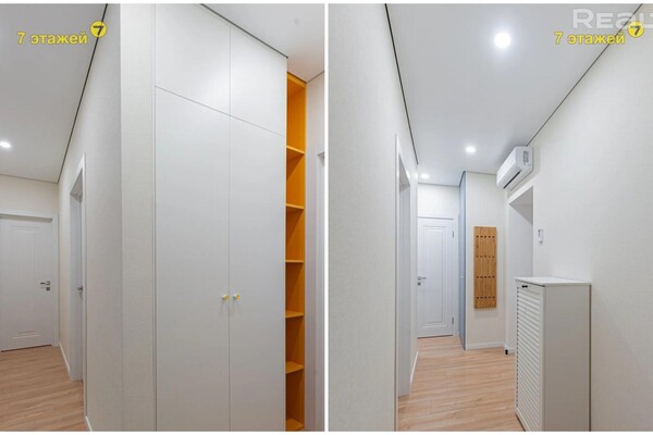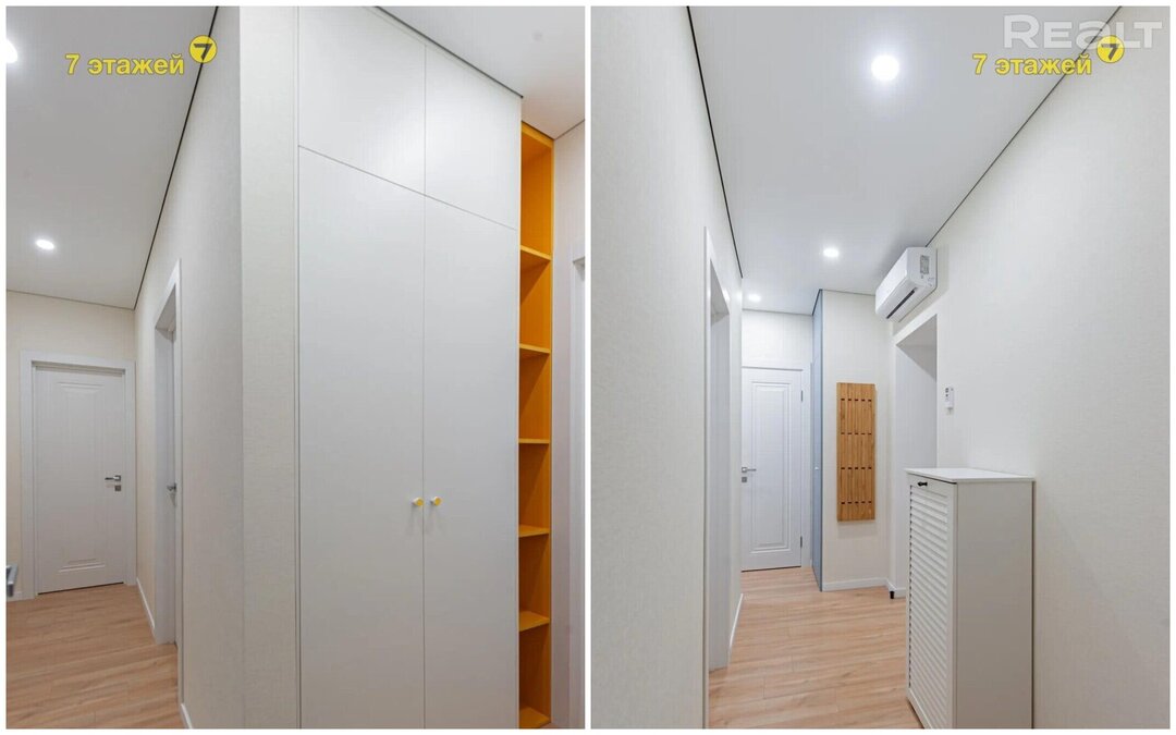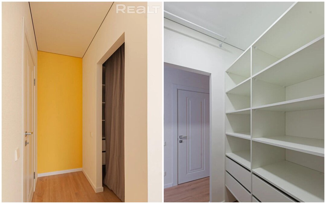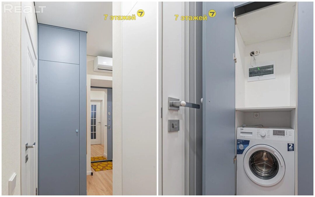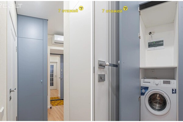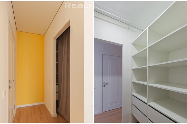 Владельцы сумели сделать в коридоре бытовой шкаф, спрятав там стиральную машину. А также выделили место под отдельную гардеробную.