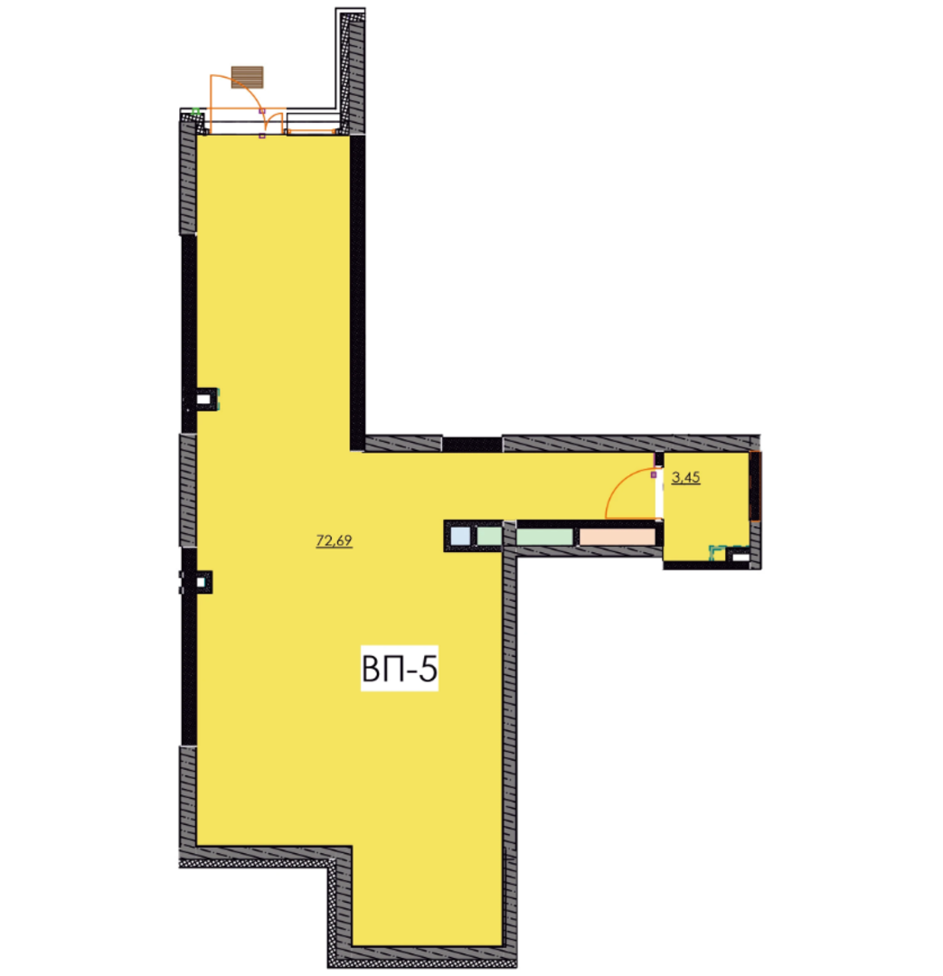 На схеме от застройщика можно увидеть все доступные решения. Так, например, выглядит планировка самого компактного помещения для бизнеса, его площадь — 75,79 м². Оно расположено в первой секции. Отдельный вход — в направлении улиц Притыцкого и Жудро.