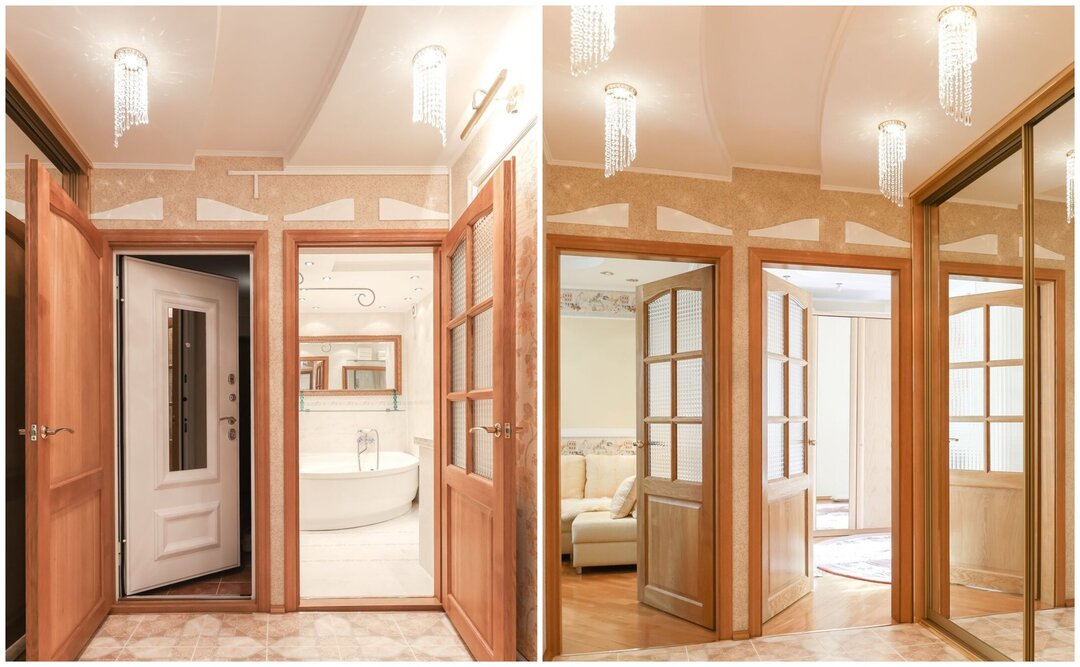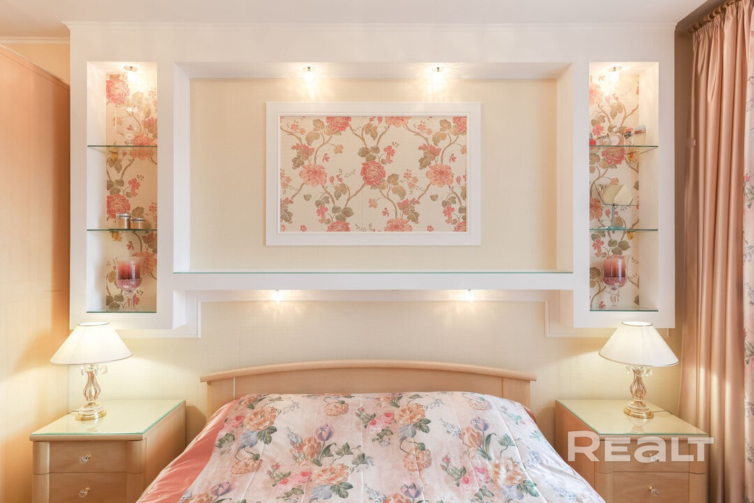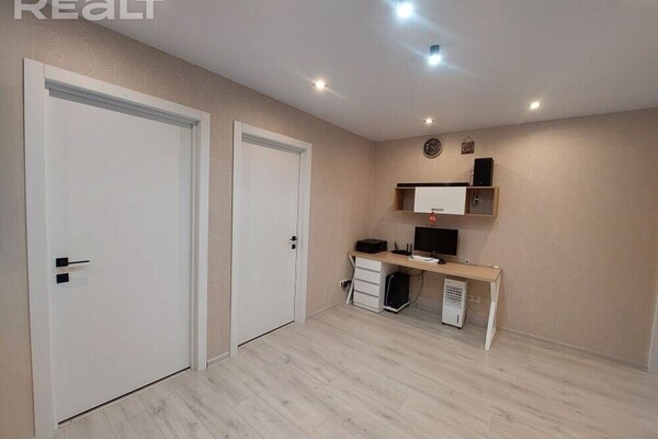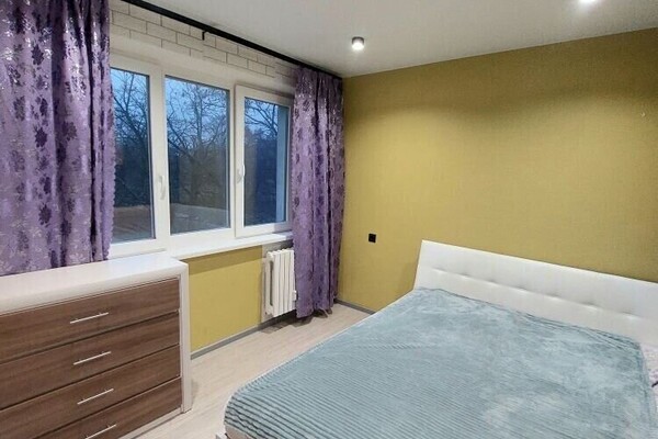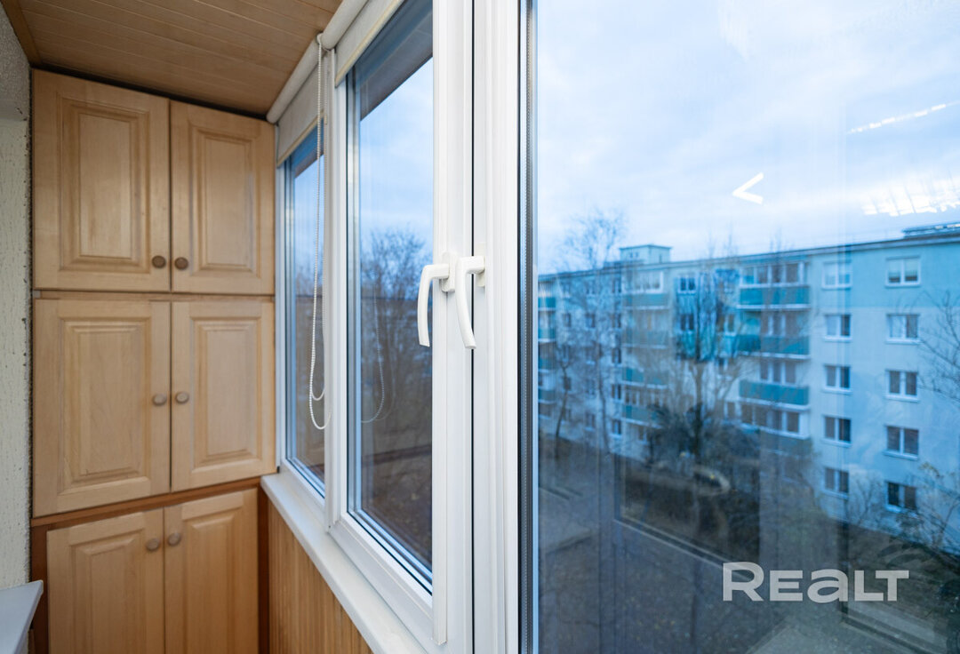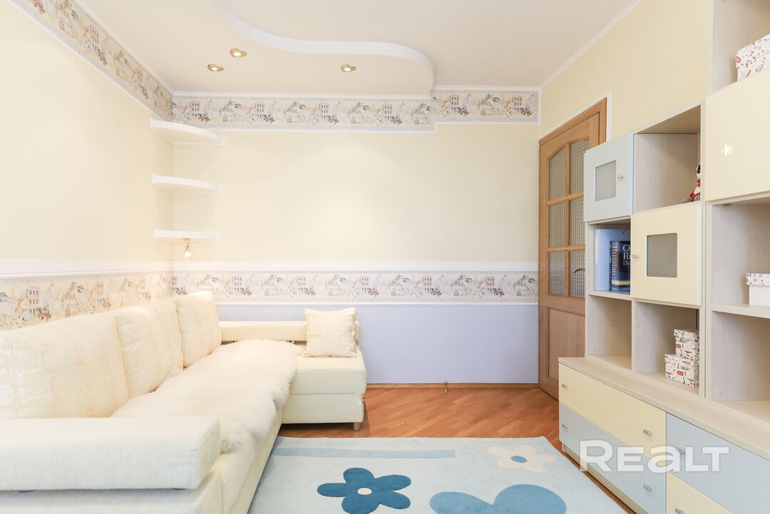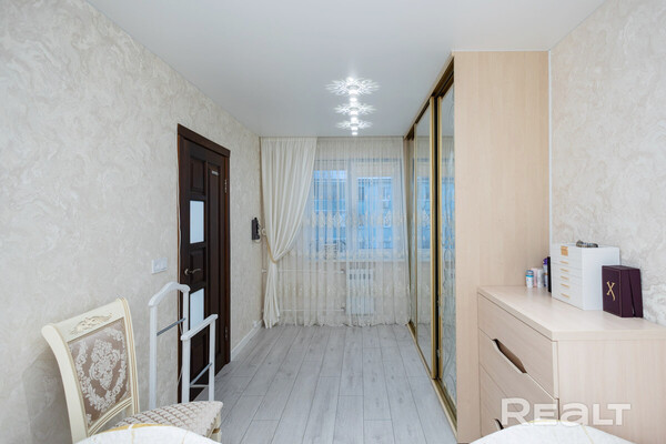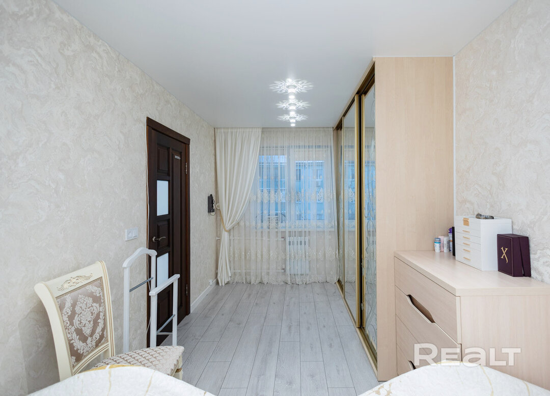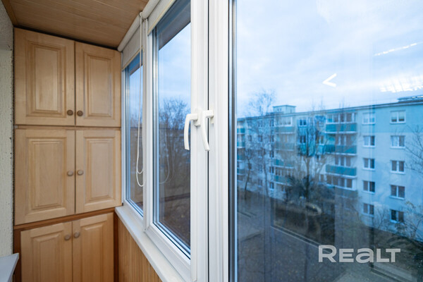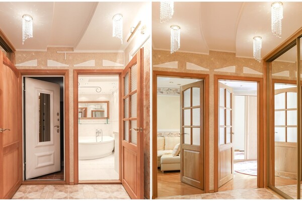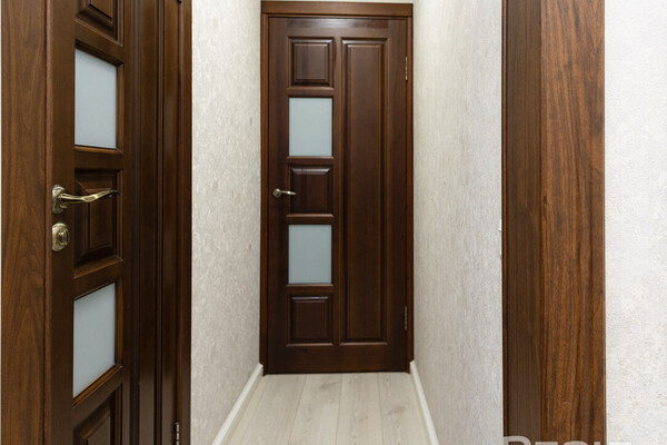 Интерьер тут обновили в прошлом году. Полностью заменена проводка, все коммуникации. Балкон застеклен, везде стоят новые пластиковые окна. Межкомнатные двери изготовлены из массива натурального дерева. Установлены чугунные батареи нового образца. Потолки — натяжные, на полу лежит ламинат.