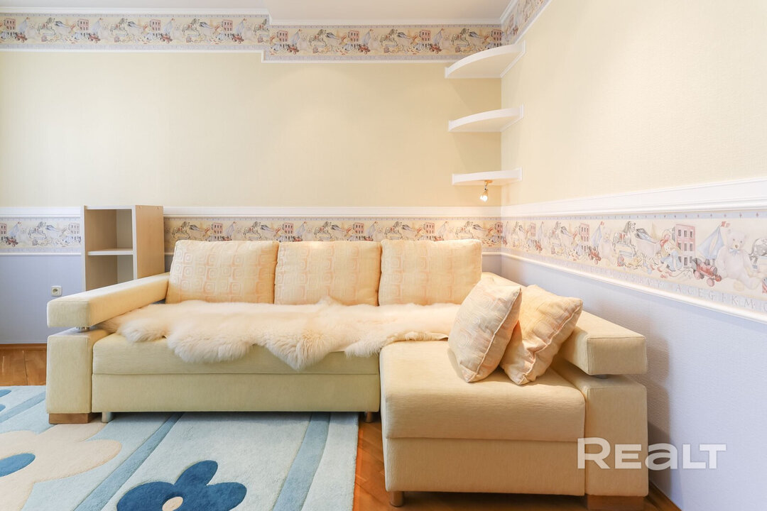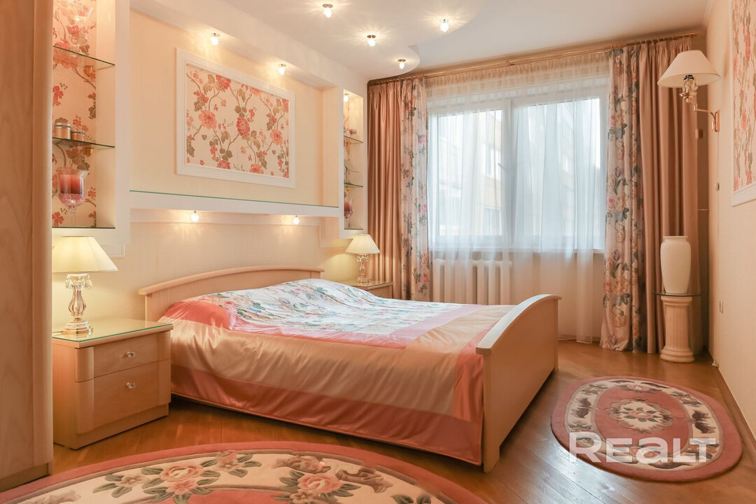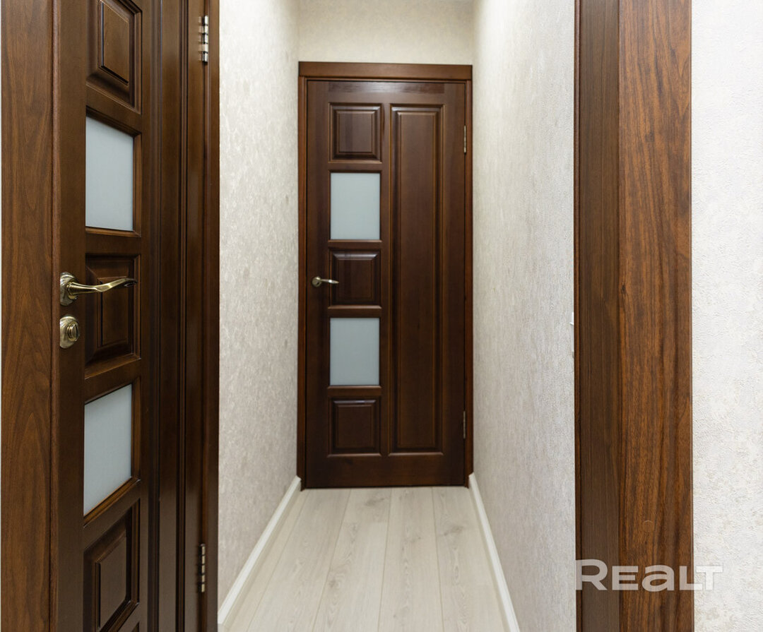 Интерьер тут обновили в прошлом году. Полностью заменена проводка, все коммуникации. Балкон застеклен, везде стоят новые пластиковые окна. Межкомнатные двери изготовлены из массива натурального дерева. Установлены чугунные батареи нового образца. Потолки — натяжные, на полу лежит ламинат.