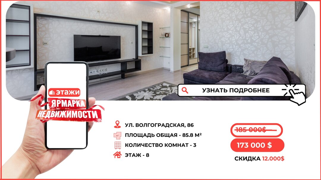 6. Роскошная 3-комнатная квартира на комфортном 8 этаже кирпичного 11-этажного дома 2009 года постройки по адресу: ул. Волгоградская, 86.