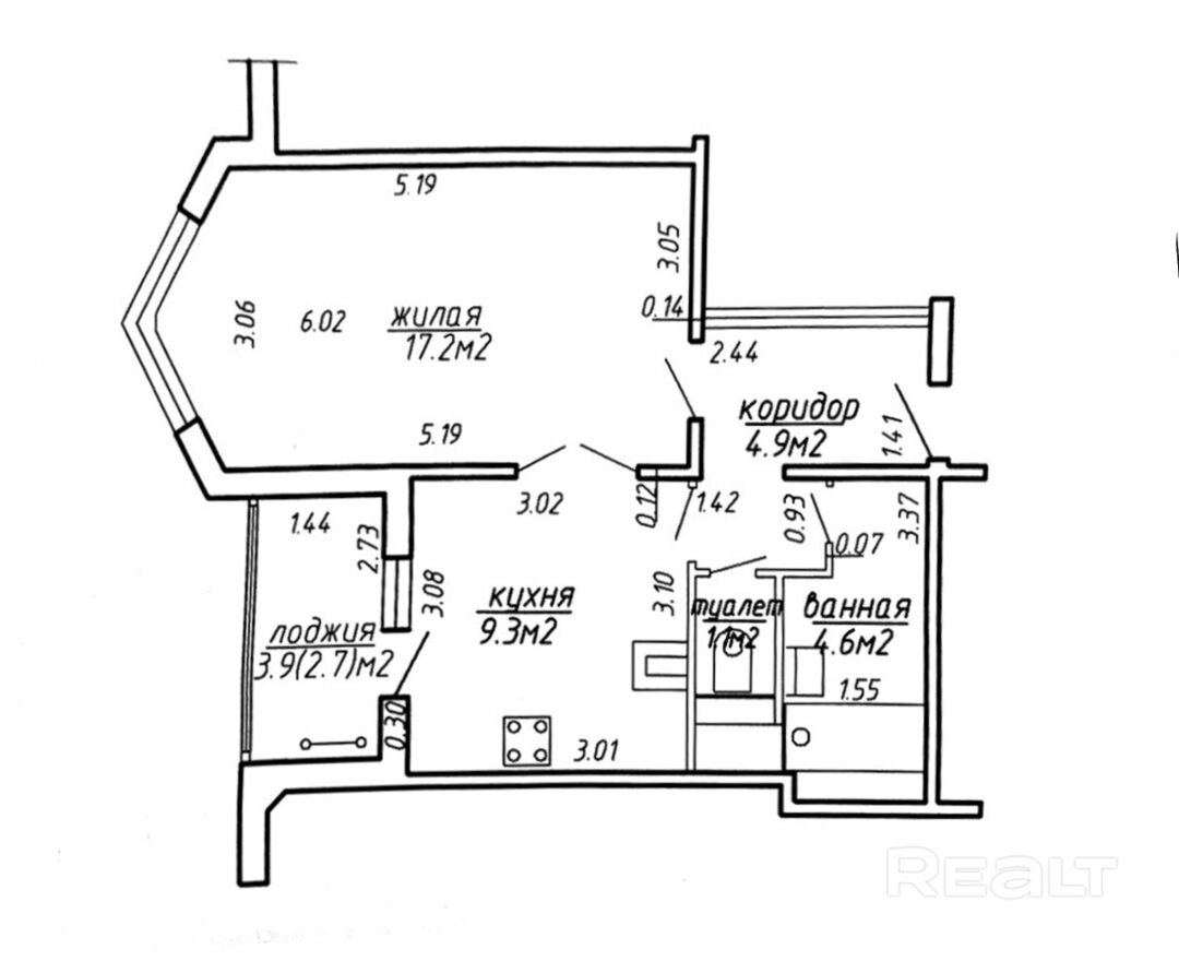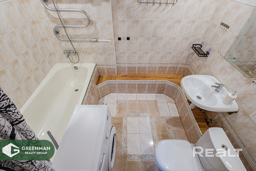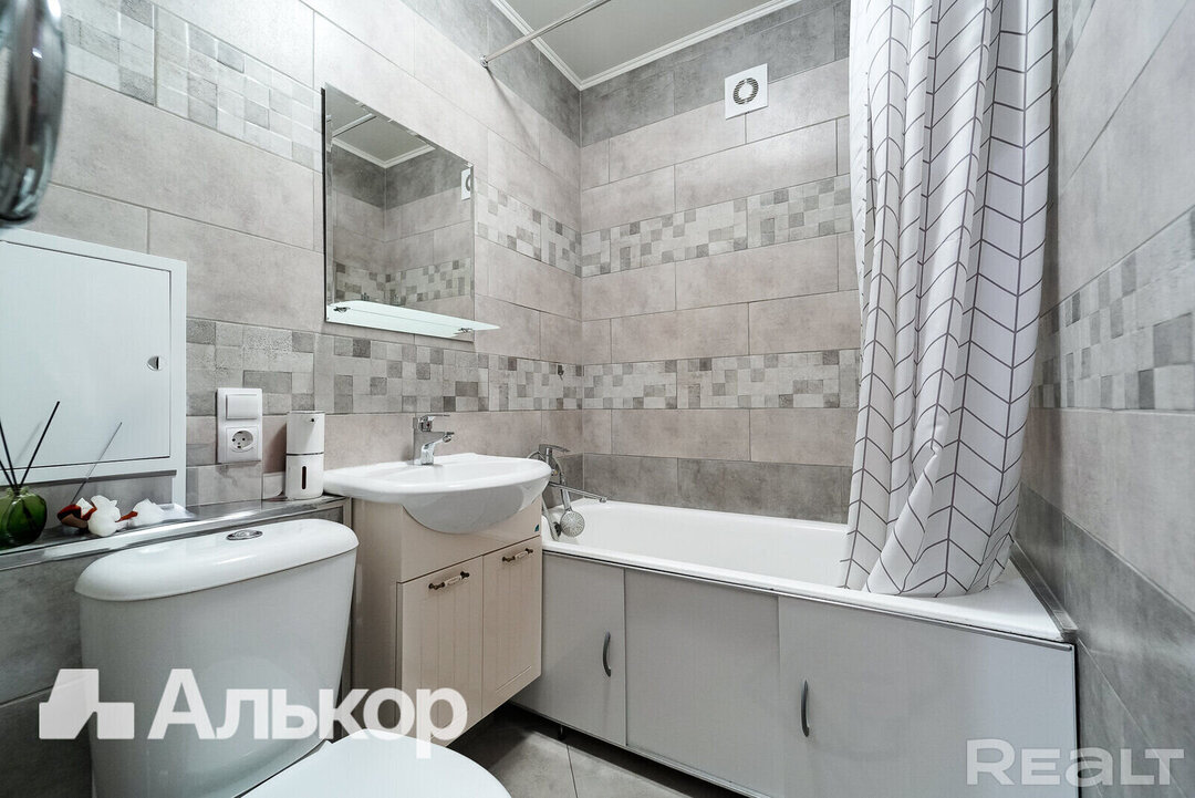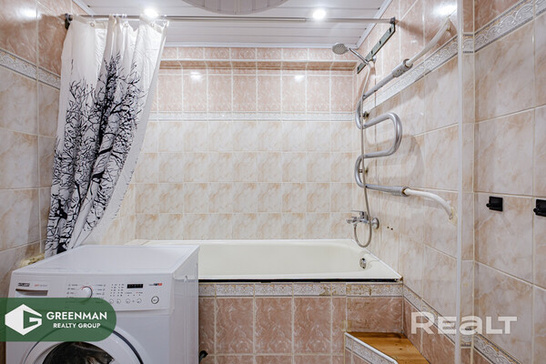 Общая площадь квартиры — 33 метра, жилая — 17 квадратов, кухня занимает 7 метров. На стенах поклеены обои, на полу плитка с ламинатом. Есть различные вариации освещения. В жилой комнате есть выход на застекленный балкон. Санузел раздельный. Установлена ванна и стиральная машина. В прихожей установлен шкаф. В жилой комнате мебели нет.