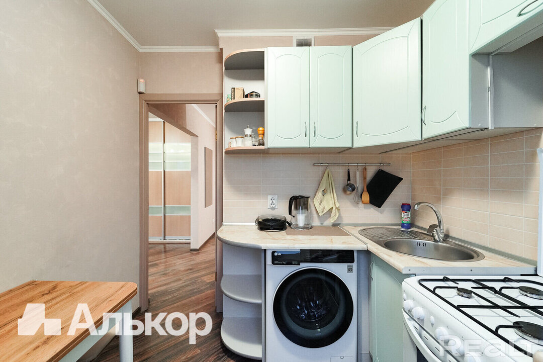 Общая площадь квартиры — 33 метра, жилая — 17 квадратов, кухня занимает 7 метров. На стенах поклеены обои, на полу плитка с ламинатом. Есть различные вариации освещения. В жилой комнате есть выход на застекленный балкон. Санузел раздельный. Установлена ванна и стиральная машина. В прихожей установлен шкаф. В жилой комнате мебели нет.