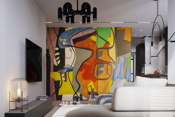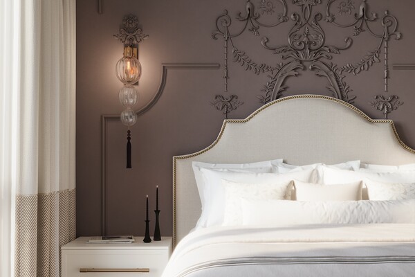 Один из проектов студии — спальня в квартире на Лученка. Здесь использовали разноуровневое освещение: подсветили барельеф за изголовьем кровати, чтобы добавить глубины, выбрали подвесные светильники у кровати для уютной атмосферы. А вместо обычной люстры в центре комнаты теперь «плывёт» лёгкое облако, наполняющее пространство мягким рассеянным светом.