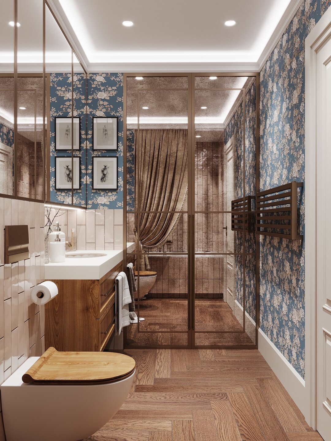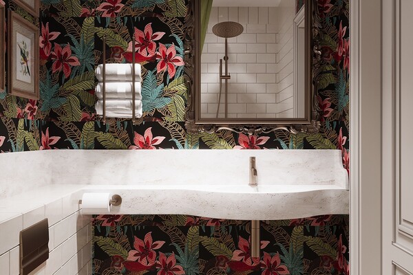 — В своих проектах мы уже активно следуем этому тренду. Так, часто применяем декоративную штукатурку, гипсовые узоры, молдинги, структурное дерево для отделки стен, лепнину, микроцемент, фрески с природными мотивами, состаренные зеркала. В одном помещении можем сочетать до пяти приемов декорирования. Это касается и ванных комнат, однако для них тотал керамогранит применяем все меньше. При использовании стараемся комбинировать его с другими материалами отделки, — рассказывает Екатерина.